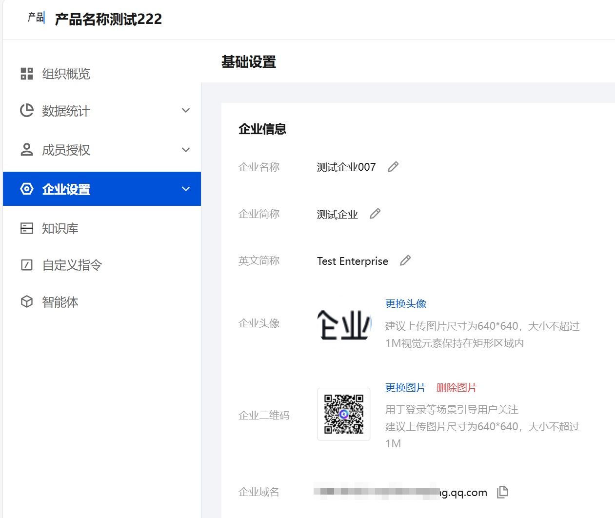 企业信息部分包含对企业名称、企业头像、企业二维码等企业信息的配置。