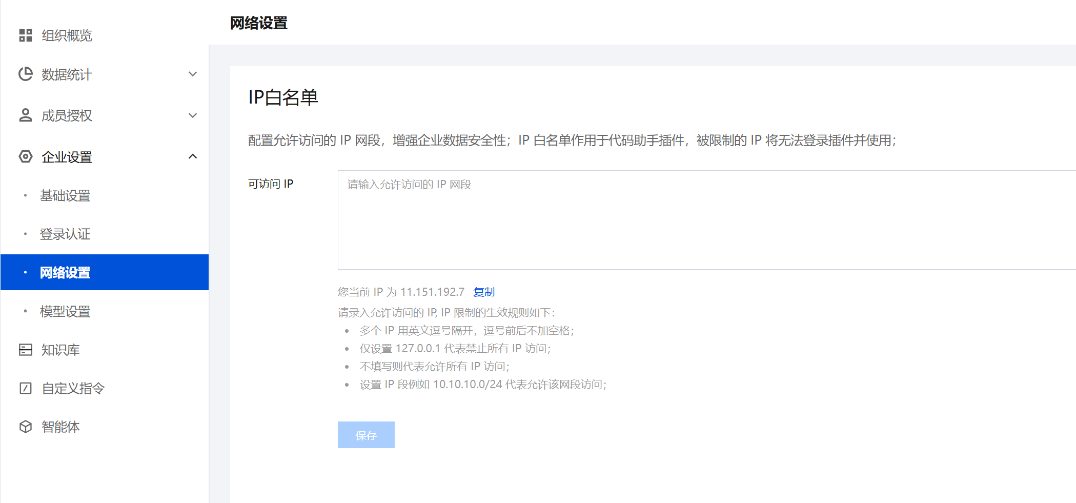 在 企业设置 > 网络设置菜单当中,配置企业的 IP 白名单,IP 白名单作用于代码助手插件,被限制的 IP 将无法登录插件并使用。