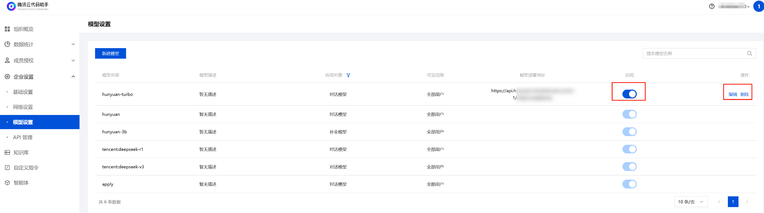 在 企业管理后台,可以对模型进行启用/关闭、编辑、删除的操作。