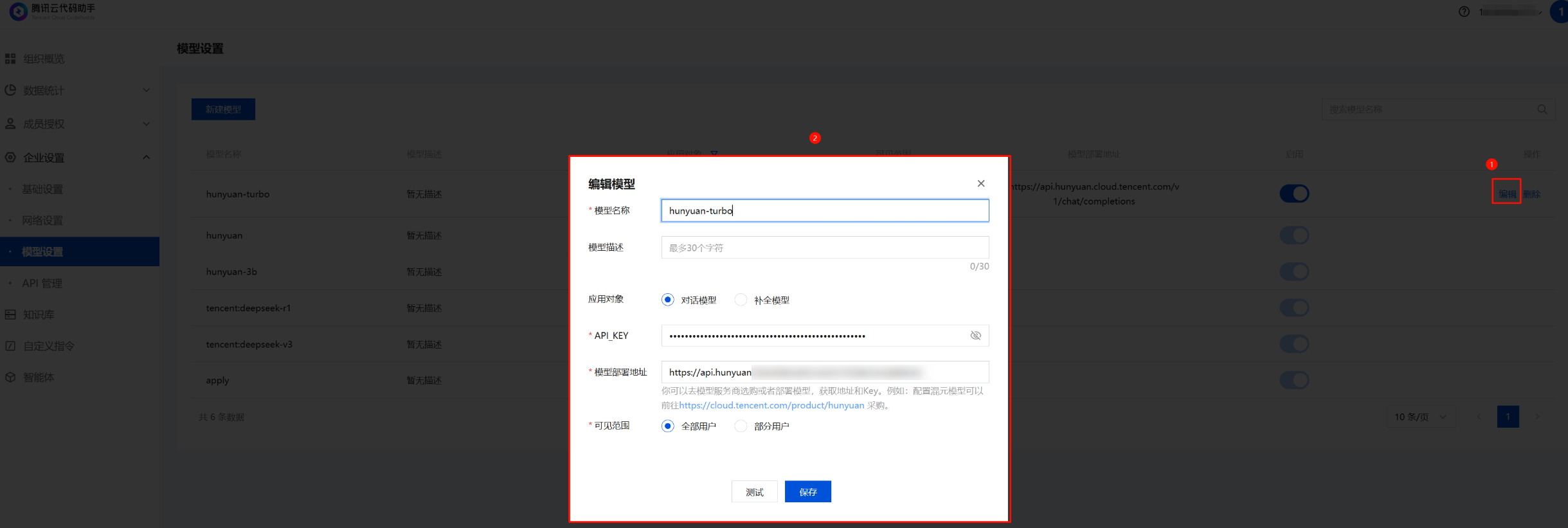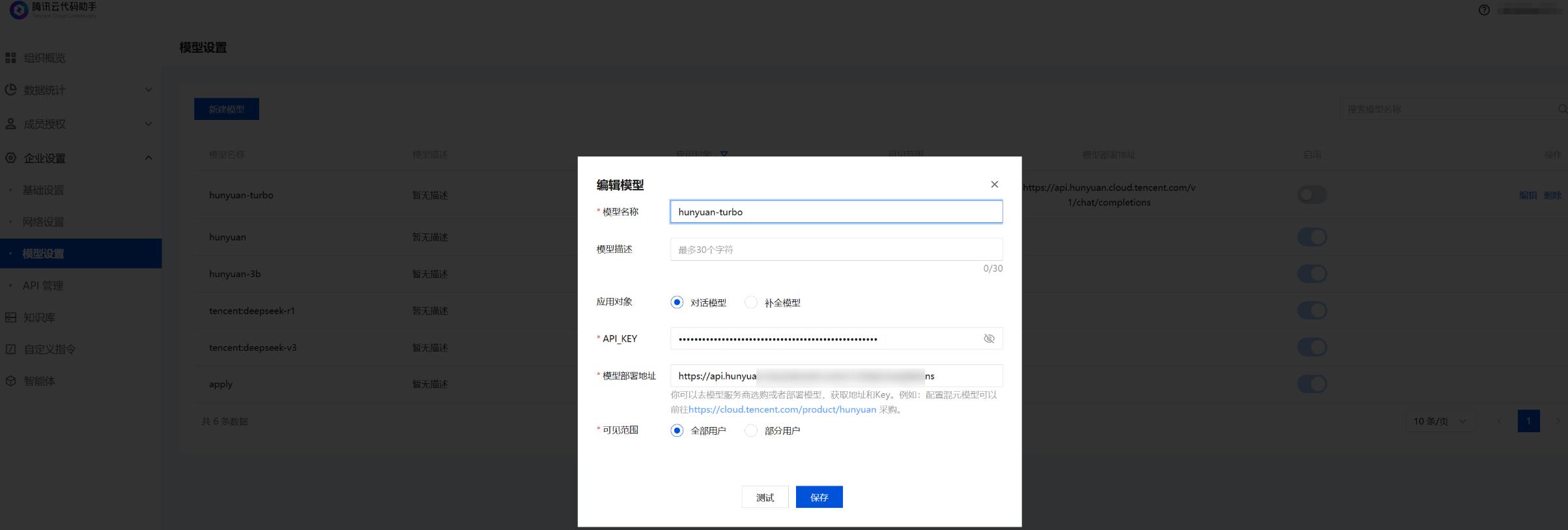 在编辑模型中,可以对模型进行编辑,包括用户可见范围、模型部署地址等设置。