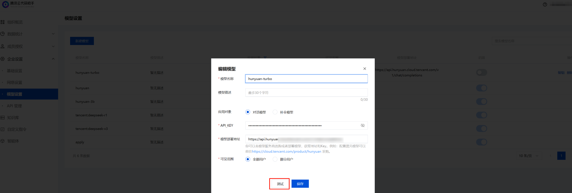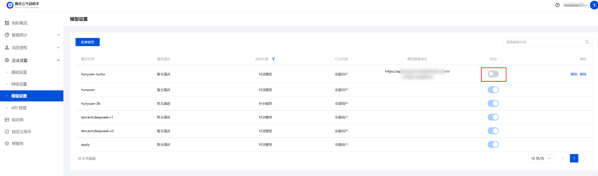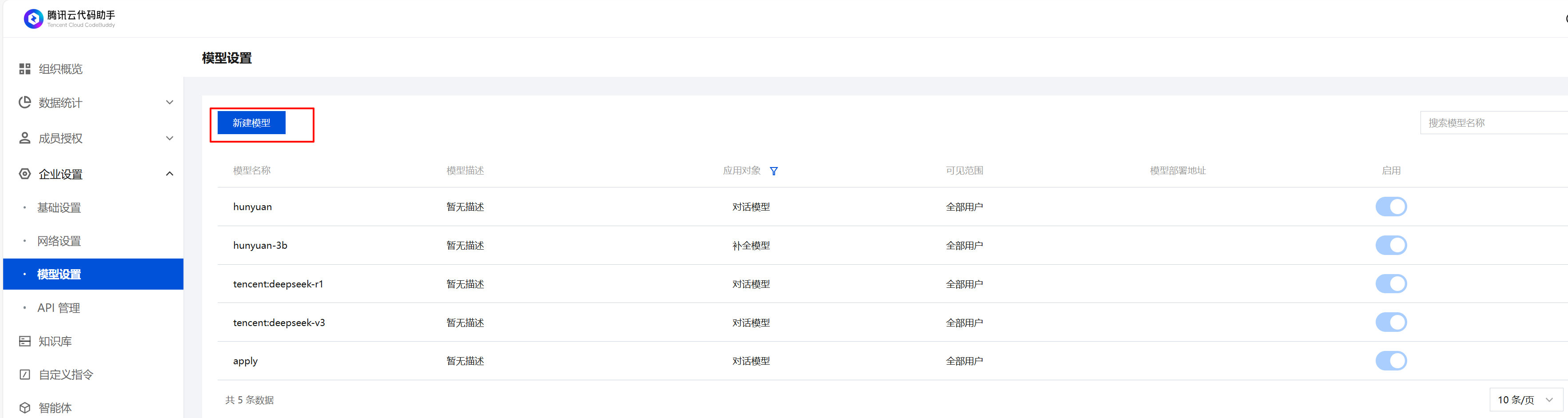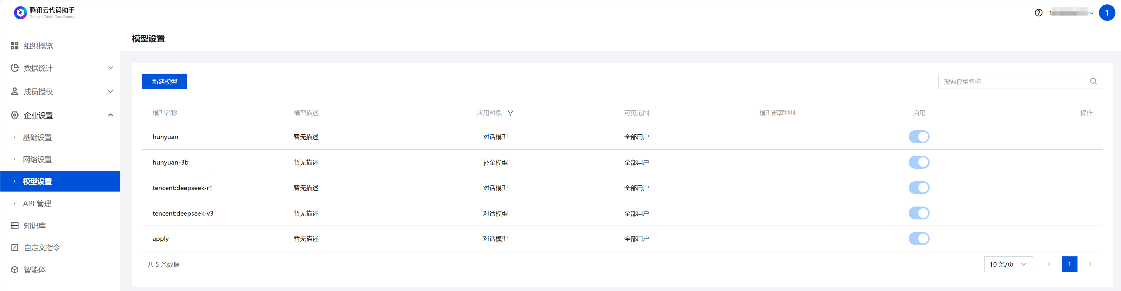 在左侧导航栏企业设置中选择模型设置。列表中展示企业下的所有模型,包括腾讯云代码助手内置的官方模型和企业自添加的模型。