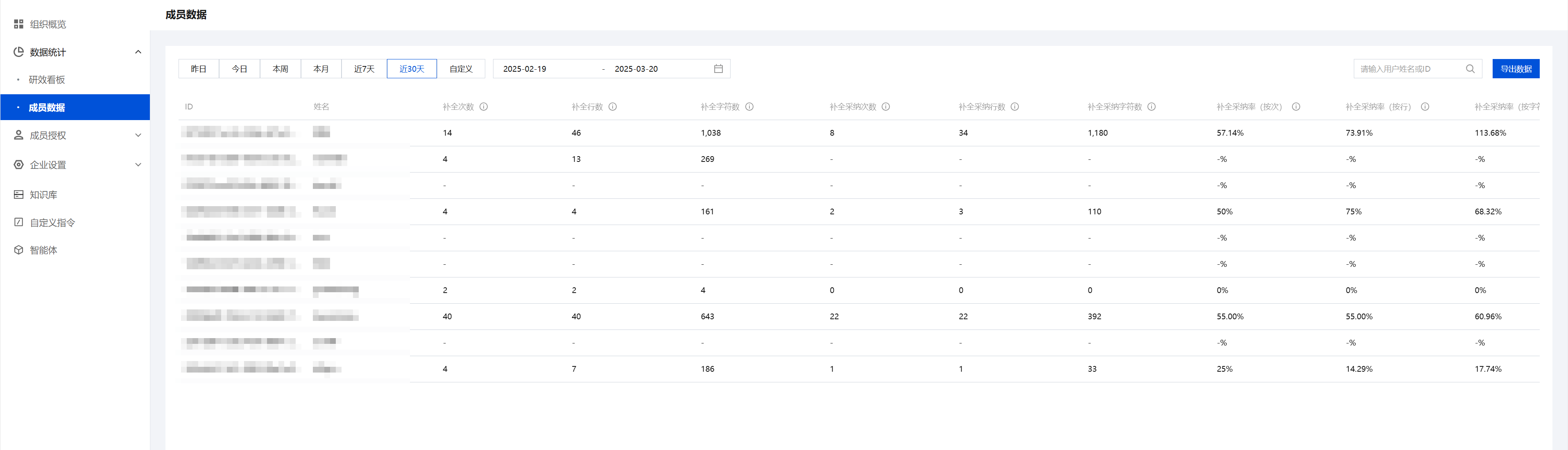支持按用户姓名或 ID进行数据筛选,同时支持一键导出数据,将数据导出为 Excel 文件。