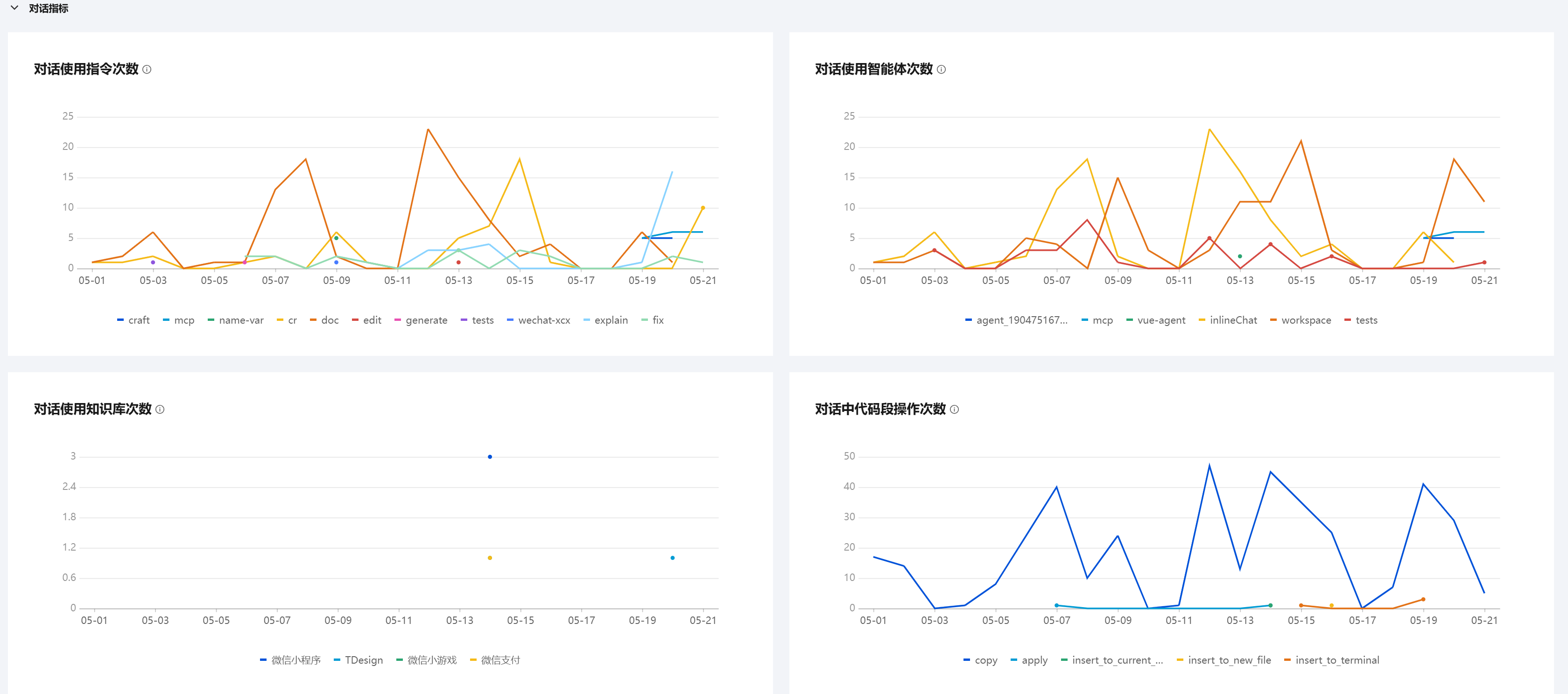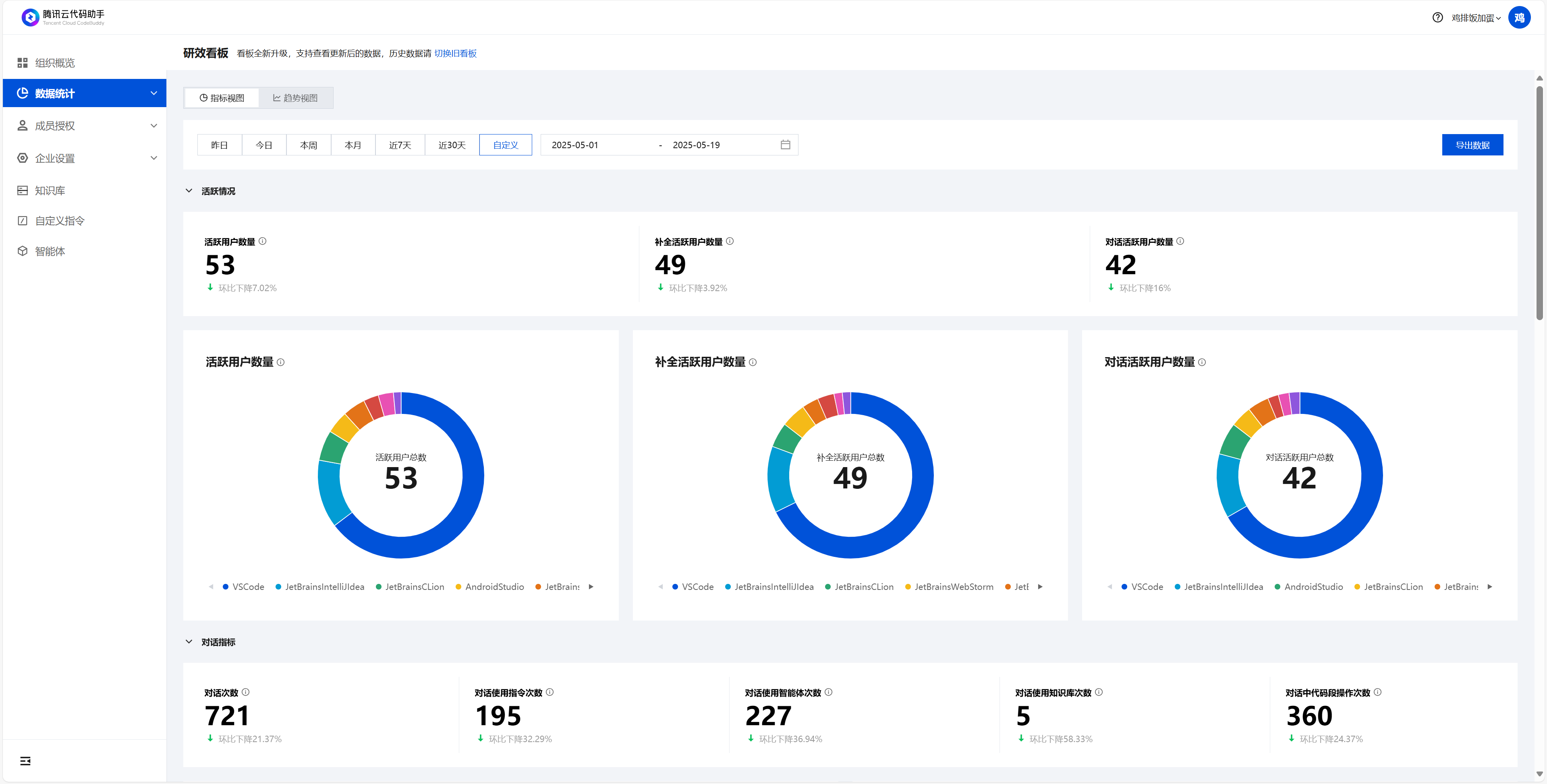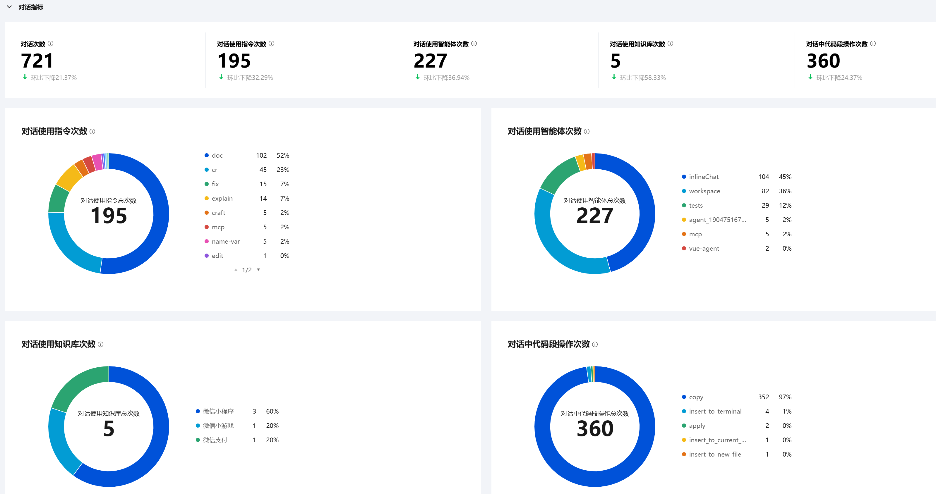 对话指标分类中包含对话次数、对话使用指令次数、对话使用智能体次数、对话使用知识库次数、对话中代码段操作次数五个指标,基本上每个指标都有文本和图卡的形式进行展示。