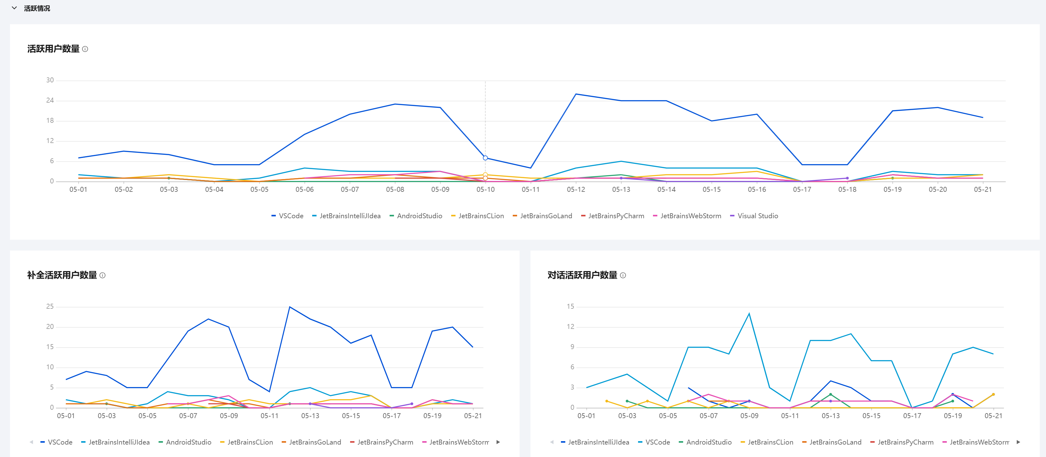 活跃情况分类中包含了活跃用户数量、补全活跃用户数量、对话活跃用户数量三个指标,每个指标可以按多种不同的 IDE 进行清晰展示。例如,可以对本月各 IDE 的活跃数量的趋势线进行查看并分析。