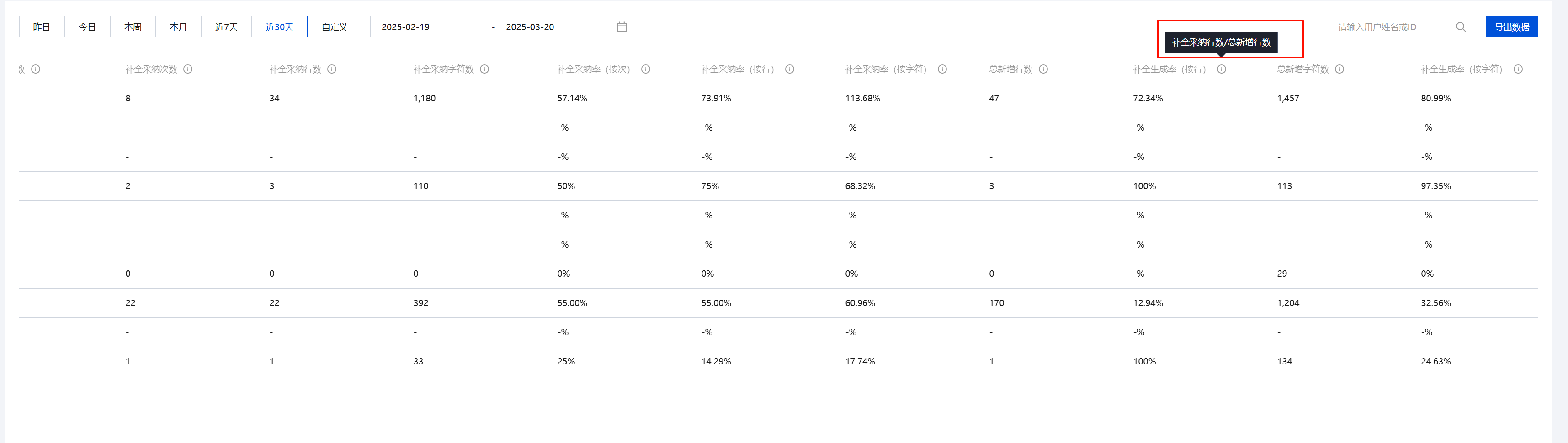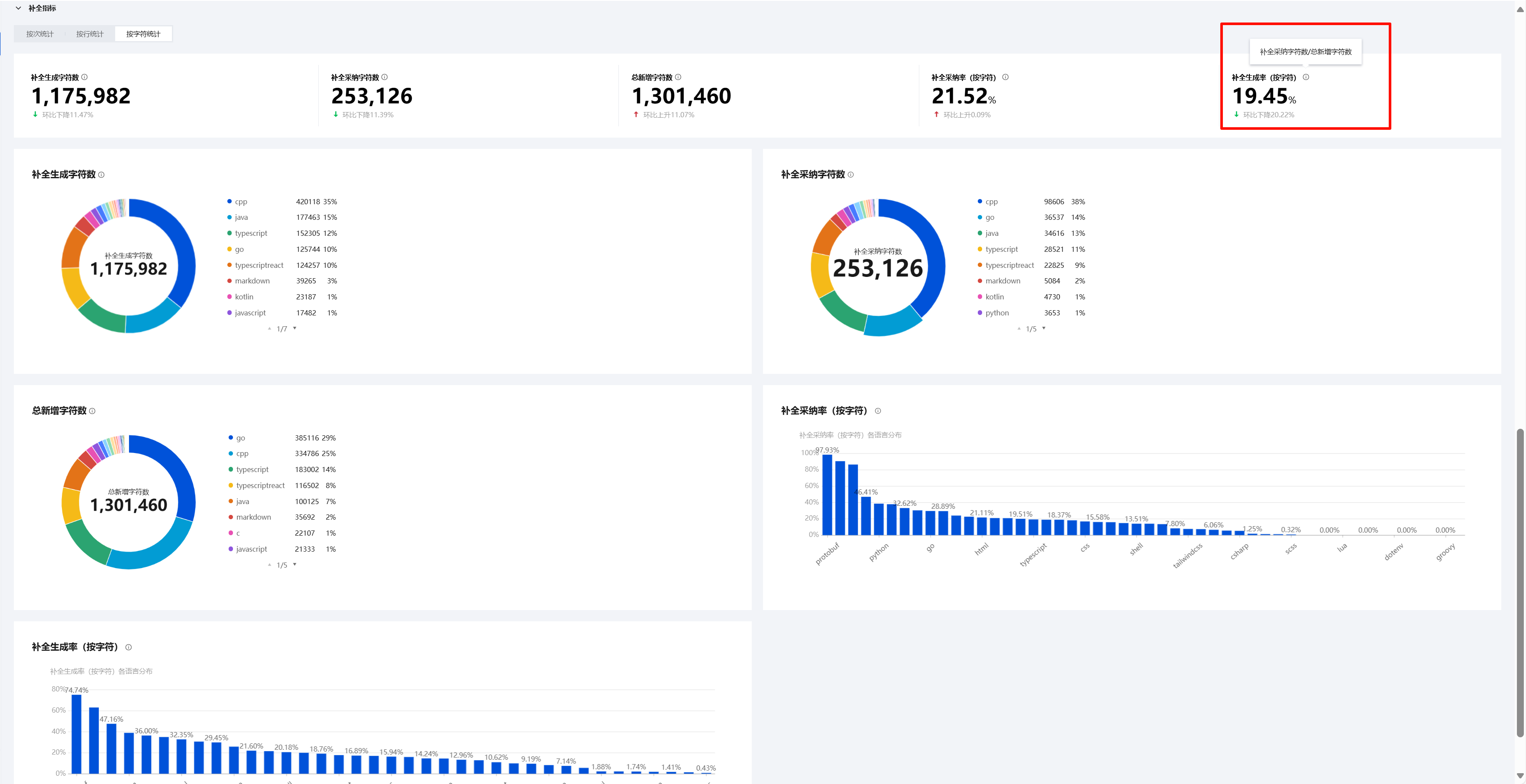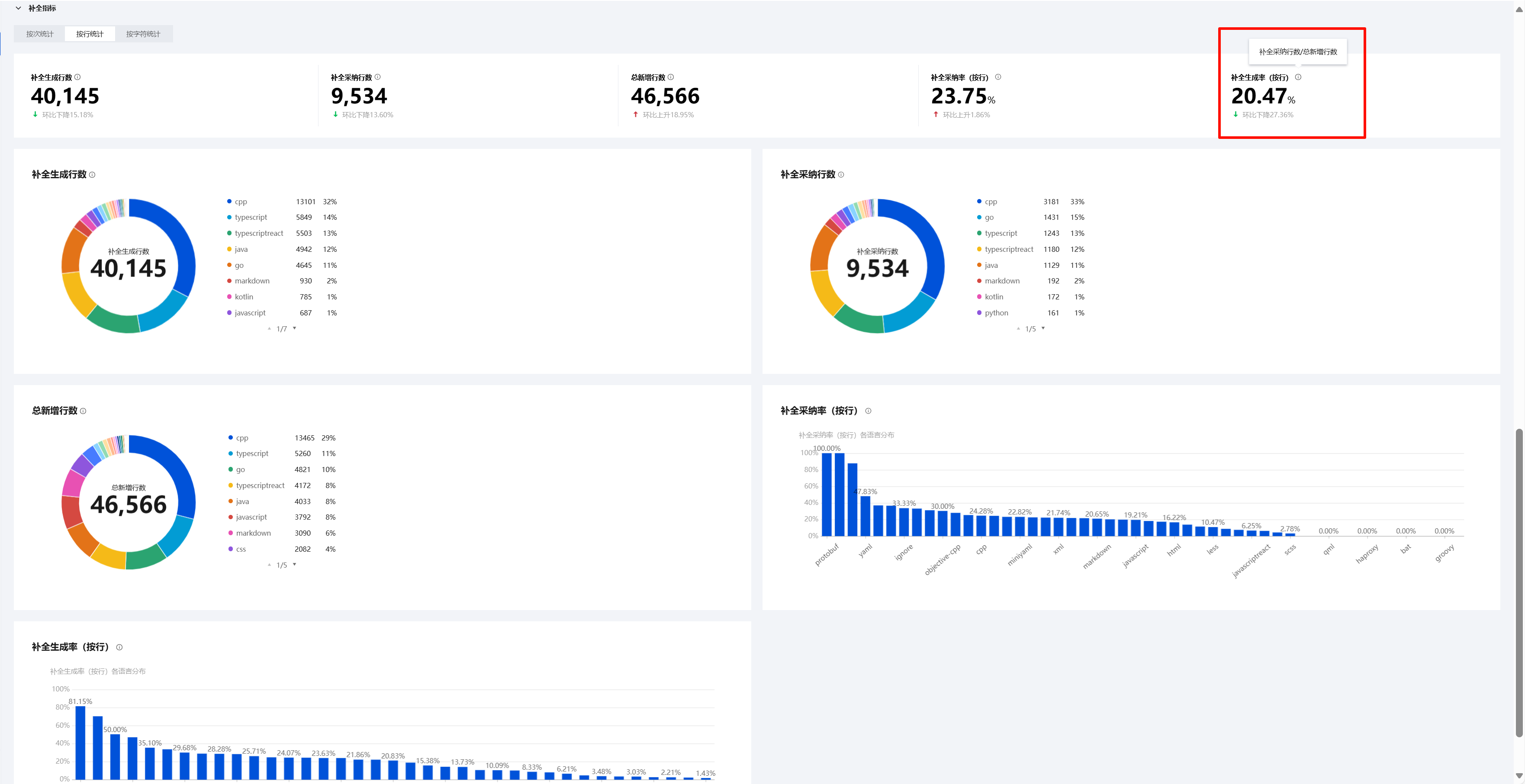 看板支持补全次数、补全行数、补全生成率(按行)、补全生成率(按次)等各项指标统计,鼠标停留在