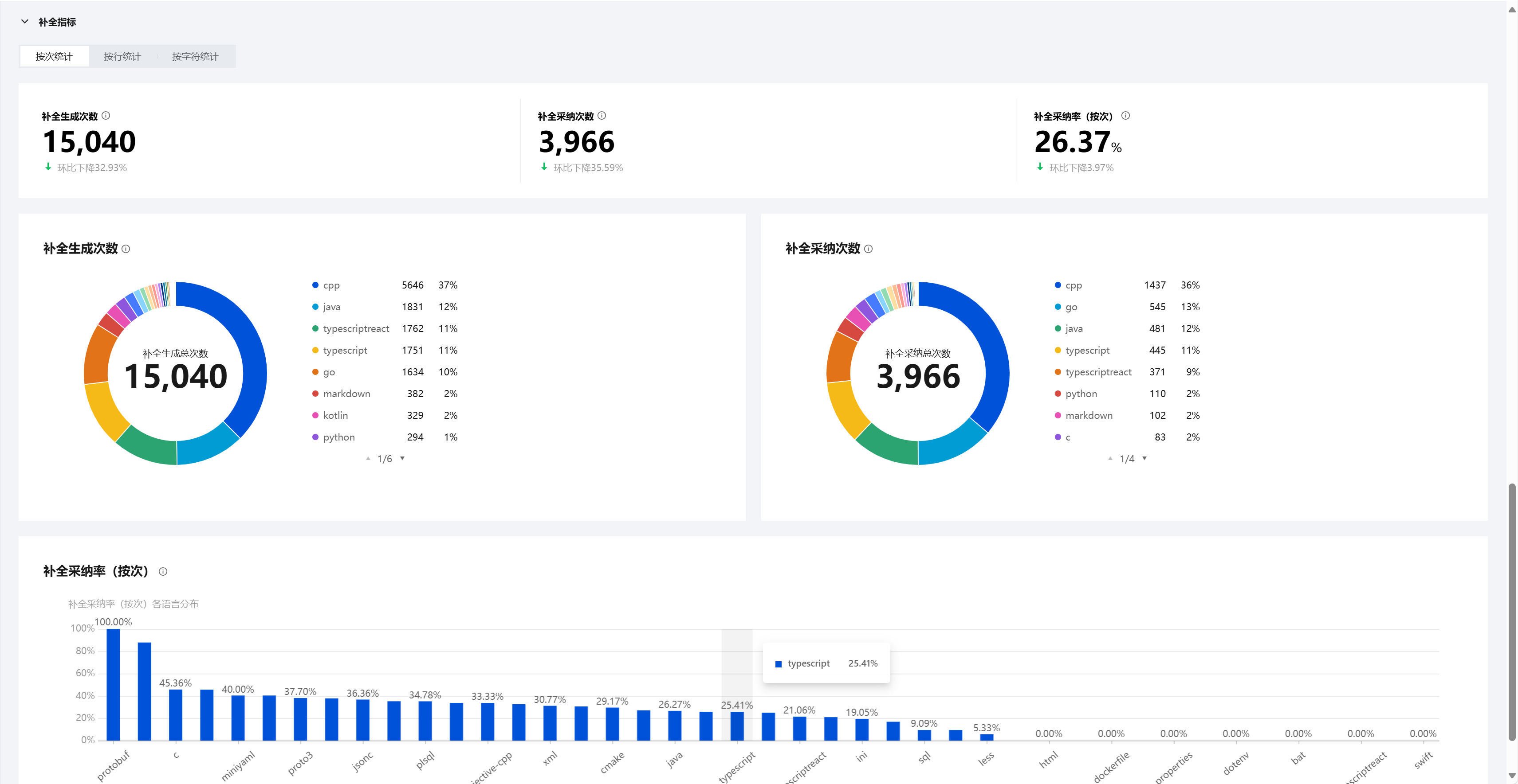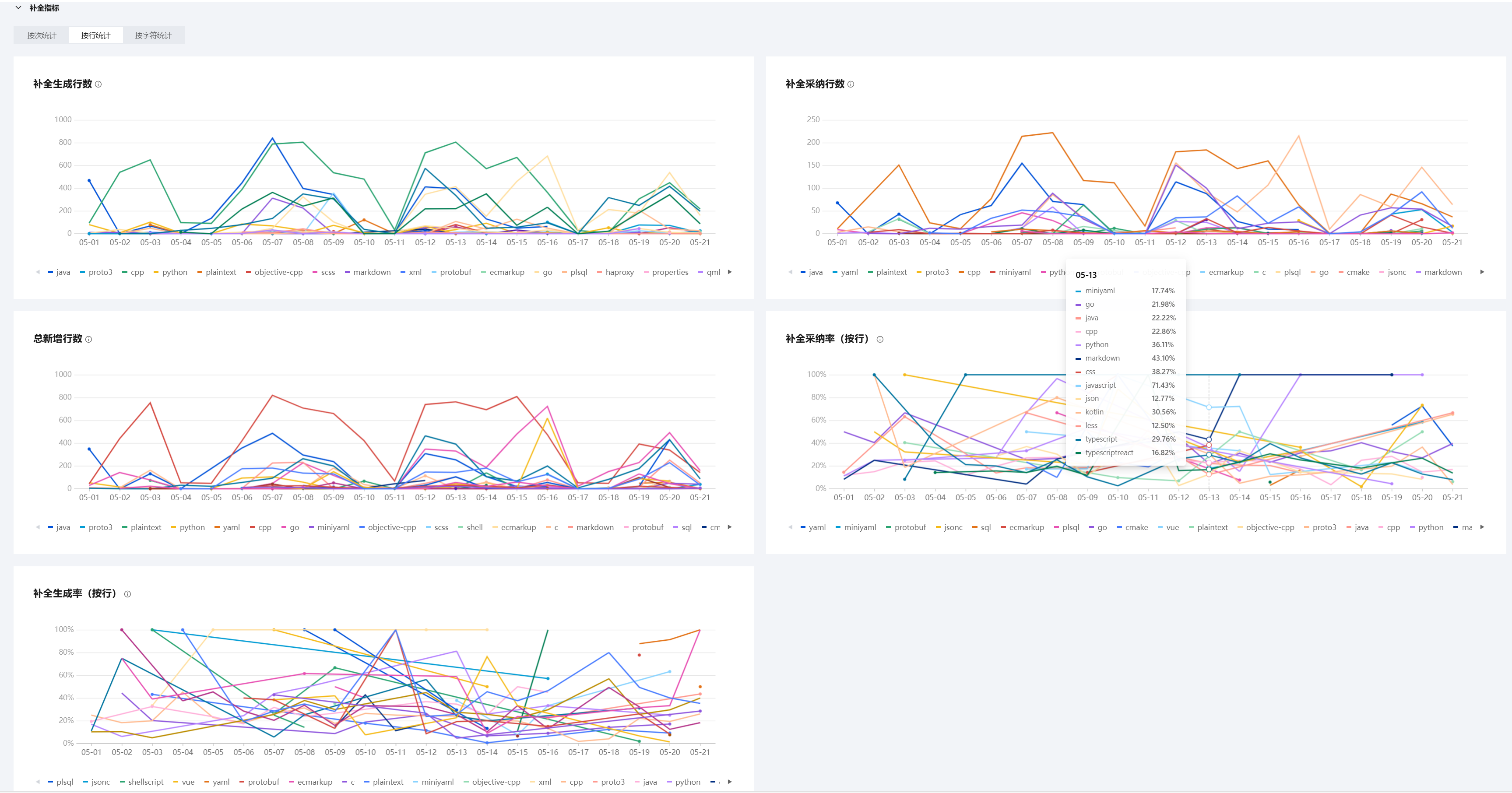 在补全指标分类中,同样分为按次统计、按行统计和按字符统计三种不同口径的统计方式,每种统计方式下包含对应的指标,每个指标支持按语言进行清晰展示。例如,可以对各个指标下不同语言的趋势线进行查看并分析。