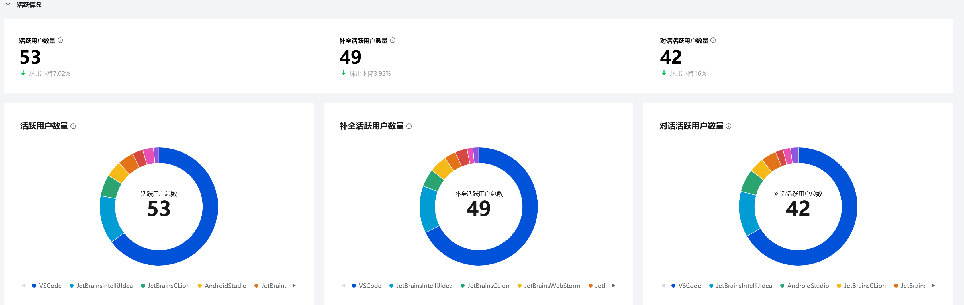活跃情况分类中包含了活跃用户数量、补全活跃用户数量、对话活跃用户数量三个指标,每个指标都有文本和图卡的形式进行展示,而且可以清楚地看到每种 IDE 的活跃数量占比情况。