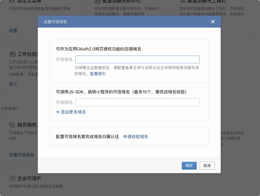 可信域名填写企业自有域名即可,需注意备案主体与企微主体相同或有关联关系。