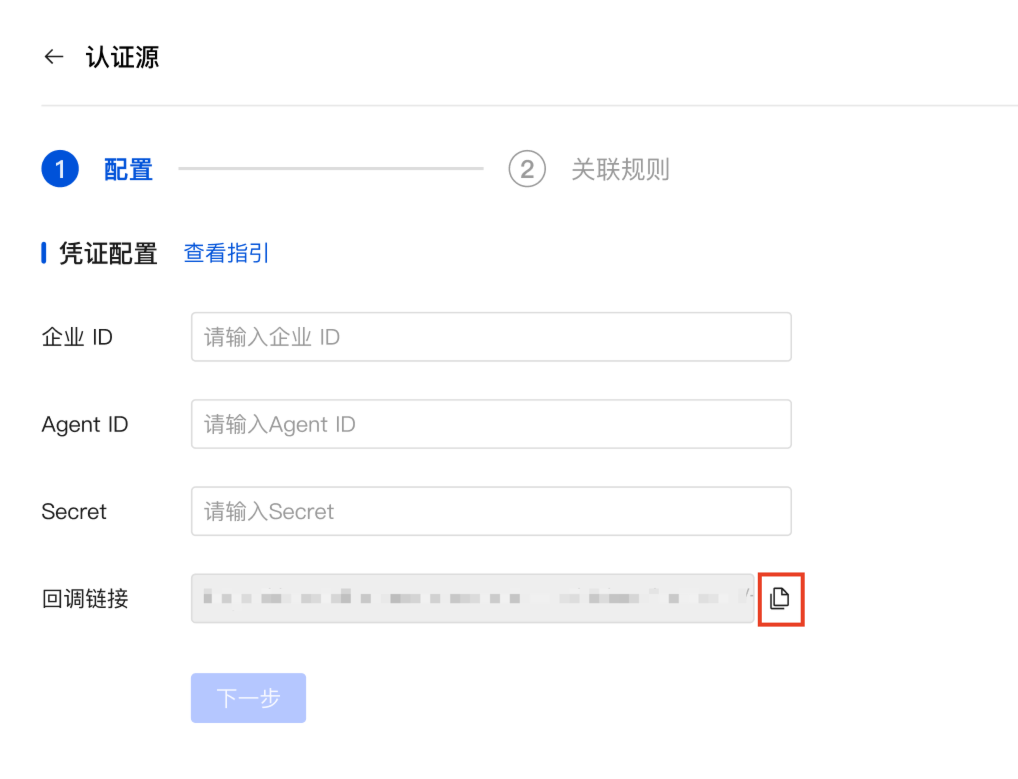 进入认证源配置流程,将企微企业 ID、企微自建应用的的 Agent ID 和 Secret 填入输入框,并复制回调地址,填写至企微自建应用的企业微信授权登录处。