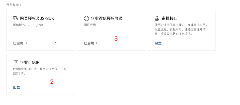 根据企微 企业自建应用安全性升级公告,请务必完成下图中的三项配置1.可信域名、2.企业可信 IP、3.网页应用授权回调,否则无法正常登录。