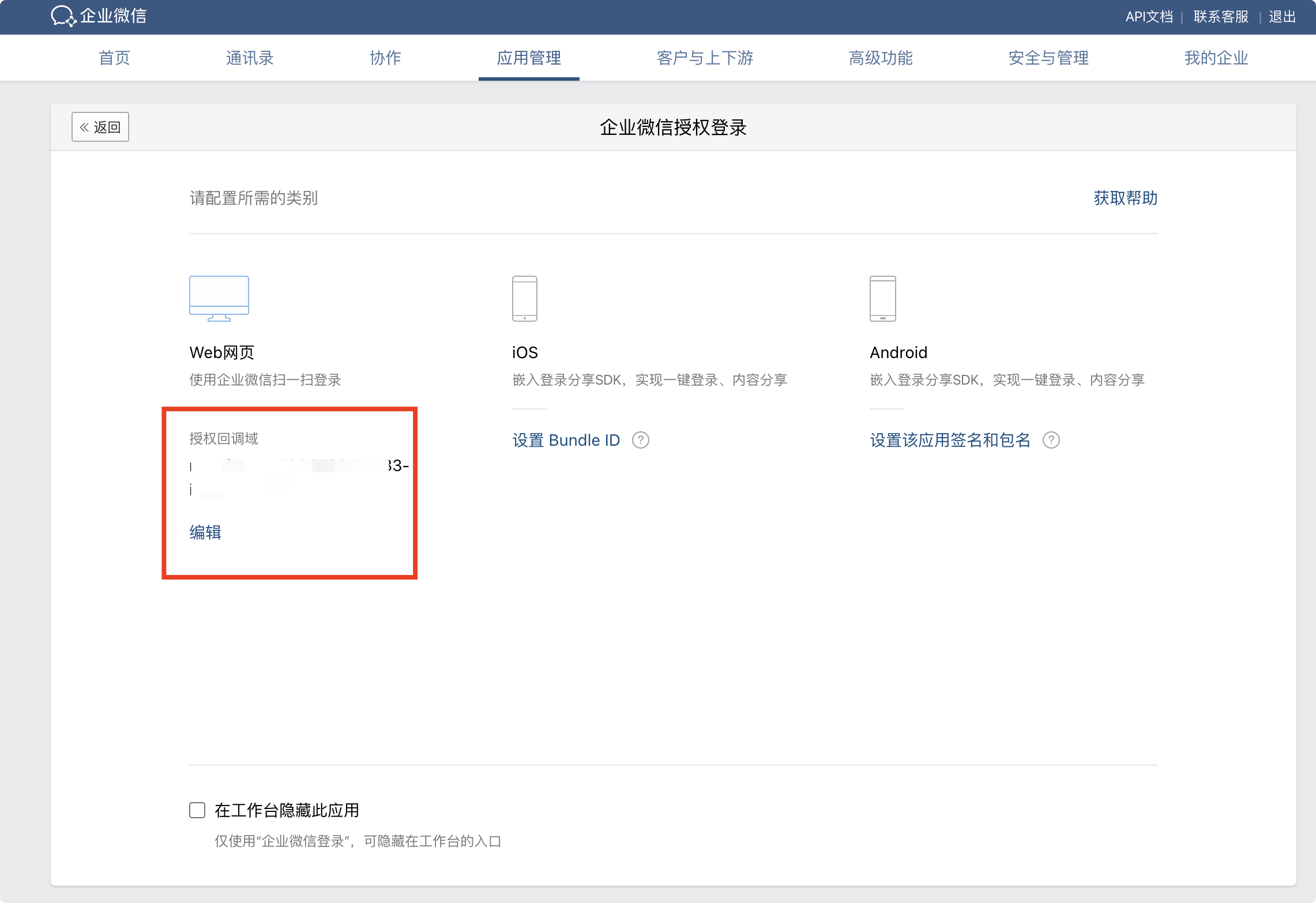 单击企业微信授权登录,进入配置详情页,在 Web 网页处填写回调链接。