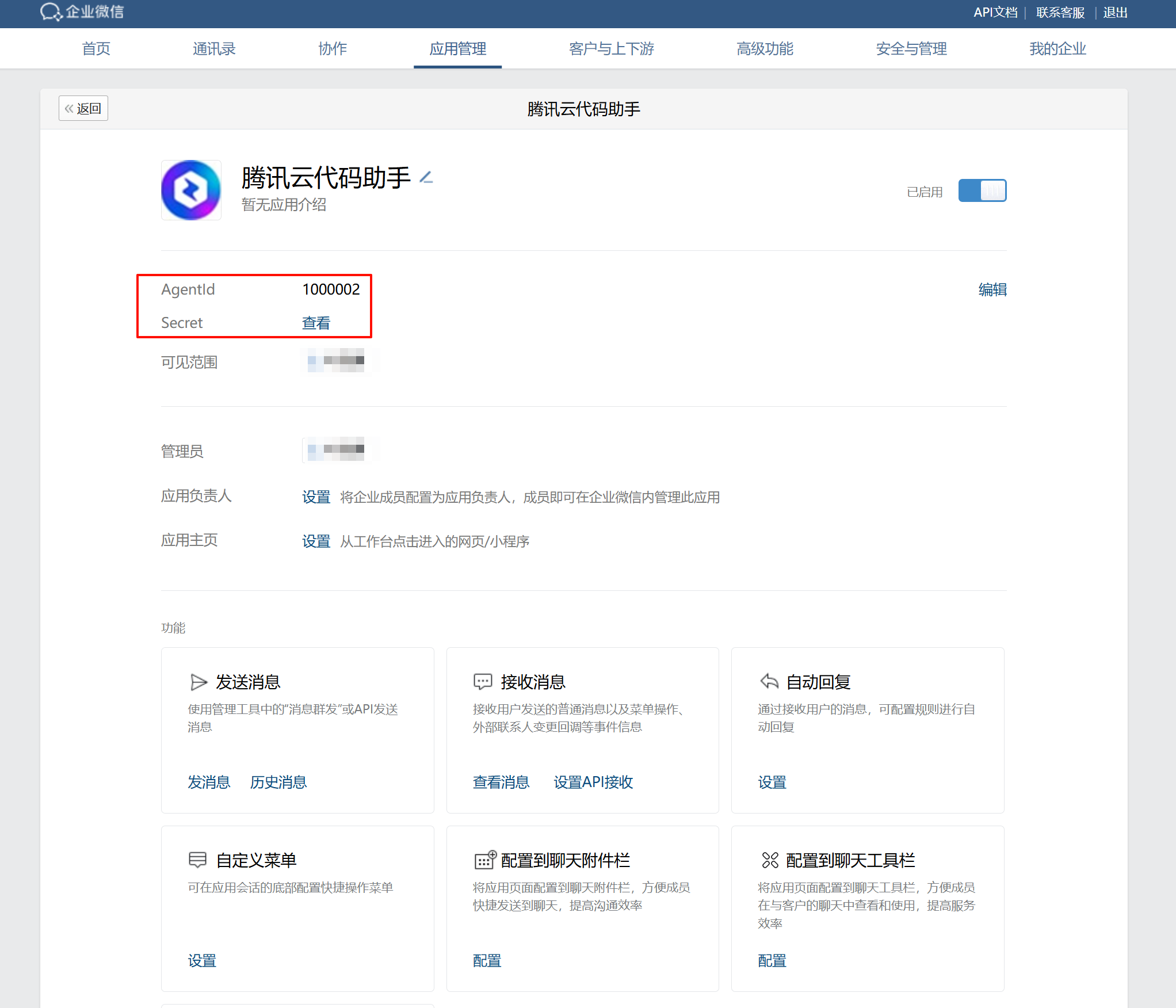 企微自建应用 Agent ID、Secret 获取位置如图: