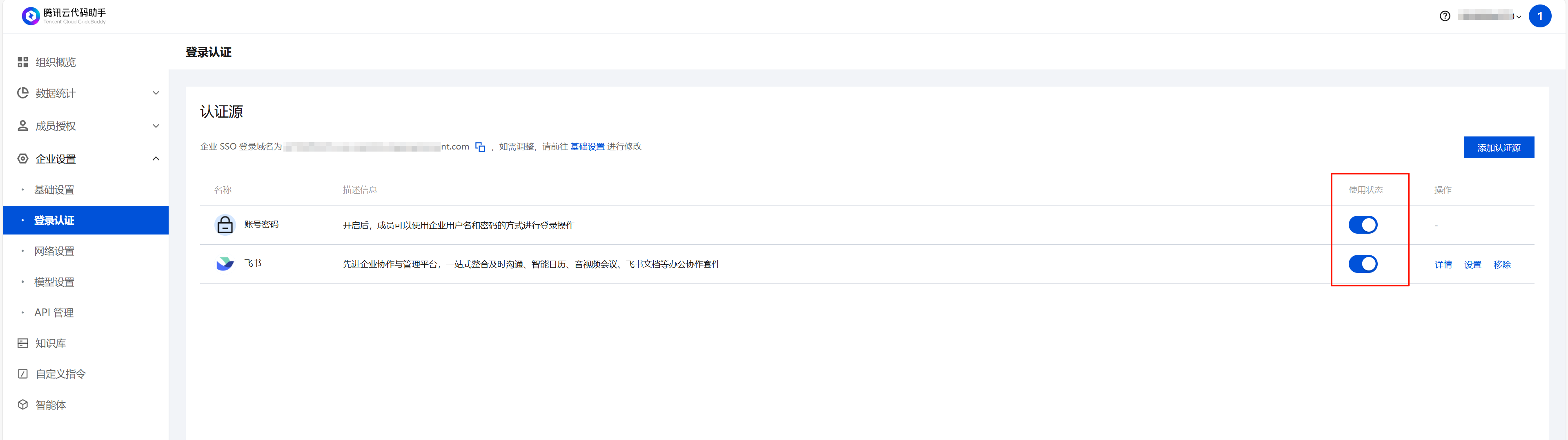 进入 腾讯云代码助手管理端,选择企业设置 > 登录认证,单击添加认证源。