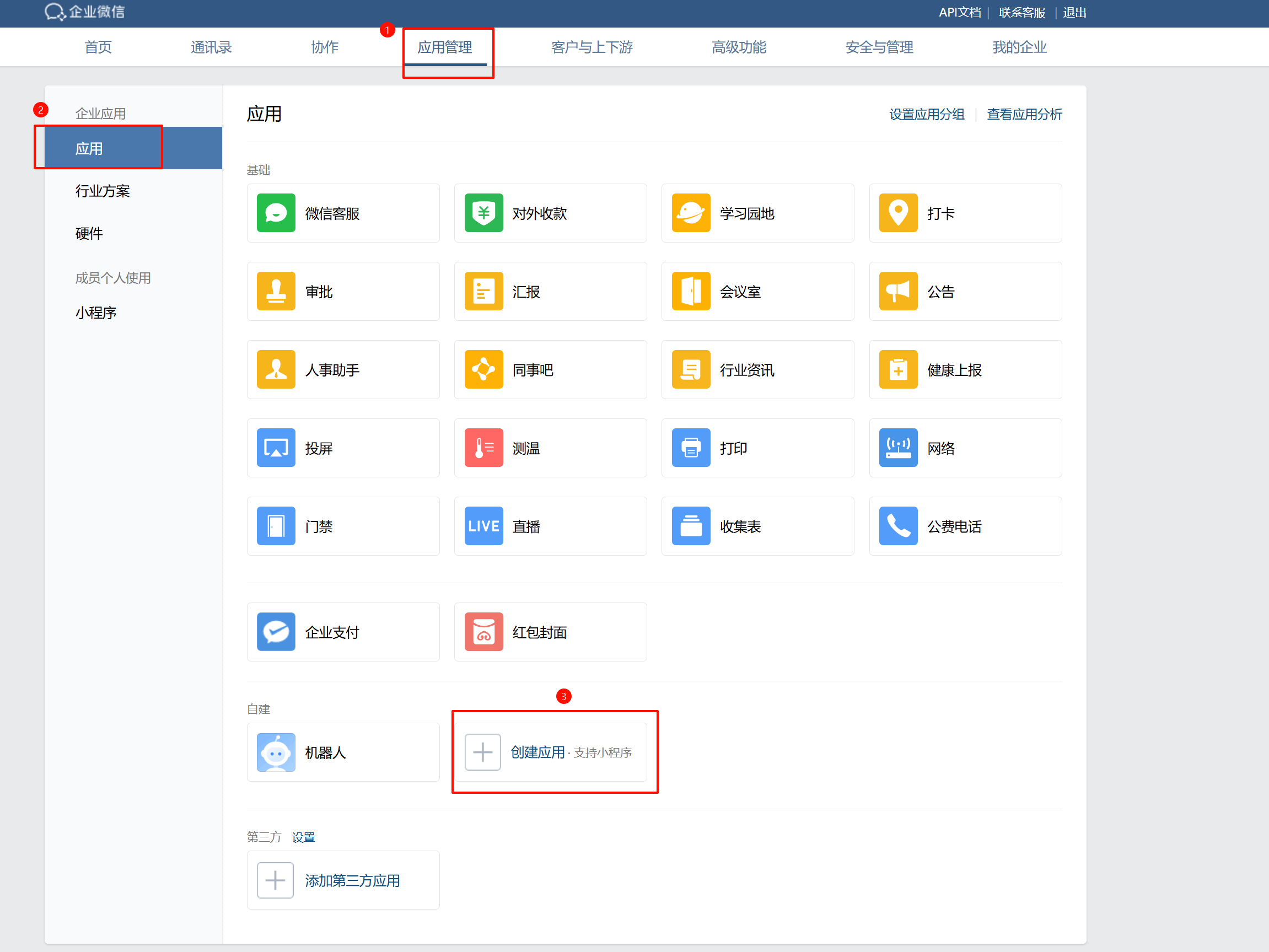 配置企微认证源需要在 企业微信管理后台/应用管理 上通过自建应用来完成,您可以按下图指引操作,或参见 企微-如何创建企业自建应用。