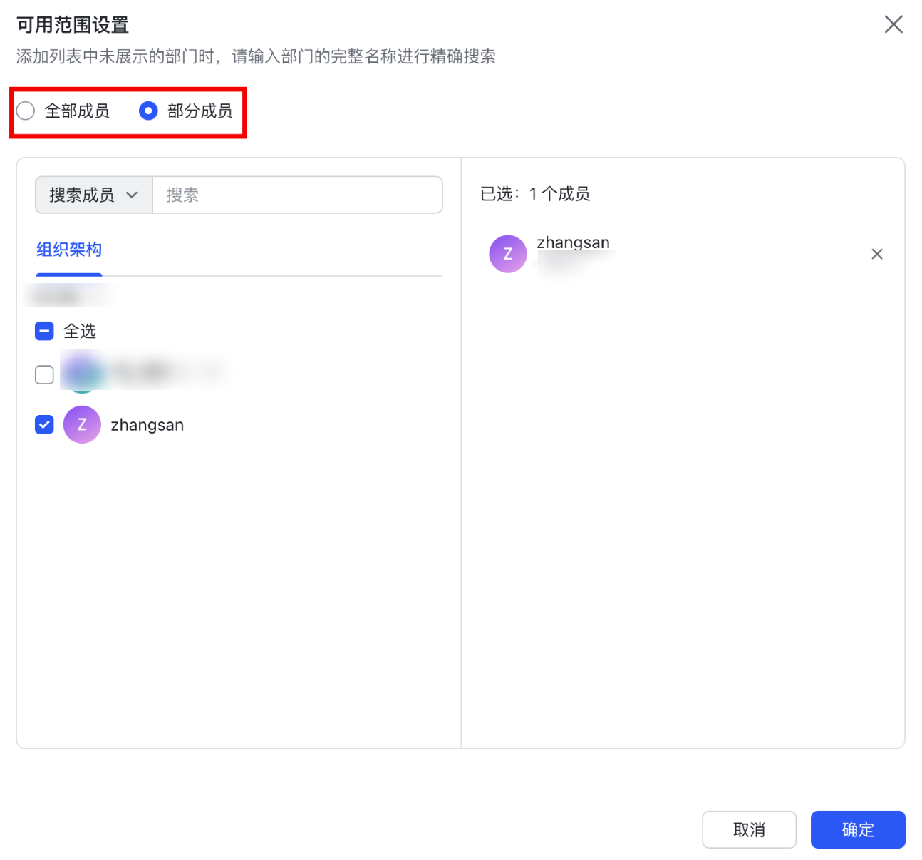 若希望飞书企业中所有成员均可使用腾讯云代码助手,则选择全部成员即可,若仅允许部分成员使用,则可选择部分成员,并添加对应的部门或成员。