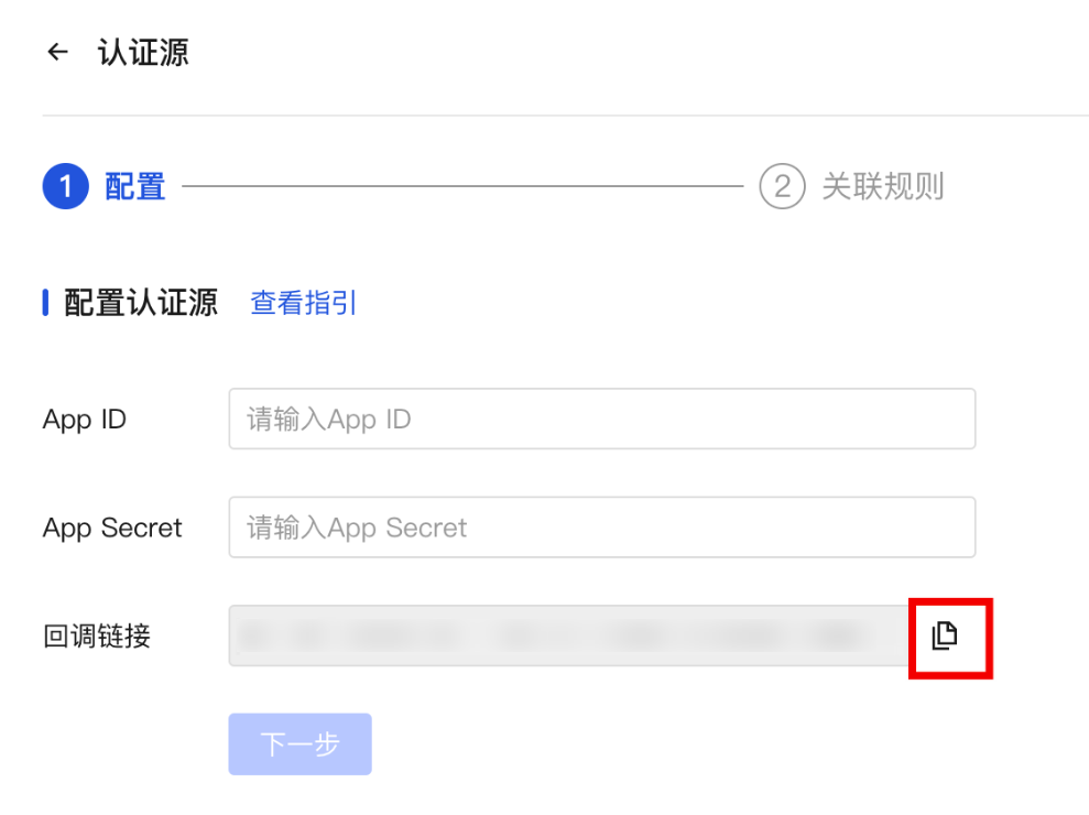 3. 进入认证源配置流程,将飞书自建应用的 App ID 和 App Secret 填入输入框,并复制回调地址,填写至飞书自建应用的“安全设置-重定向 URL”处。 飞书自建应用 App ID、App Secret 获取位置如图: 飞书自建应用重定向 URL 填写位置如图: