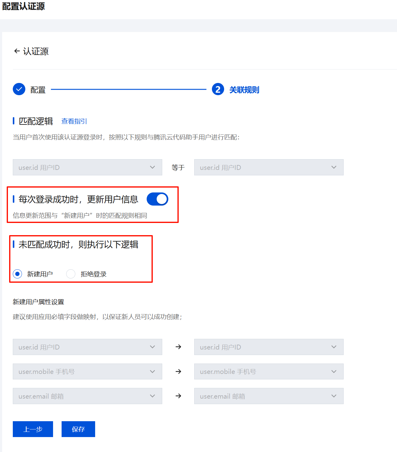 • 未匹配成功时,则执行以下逻辑:建议开启“新建用户”,若拒绝登录,则首次通过飞书尝试单点登录代码助手的用户将无法成功登录。
