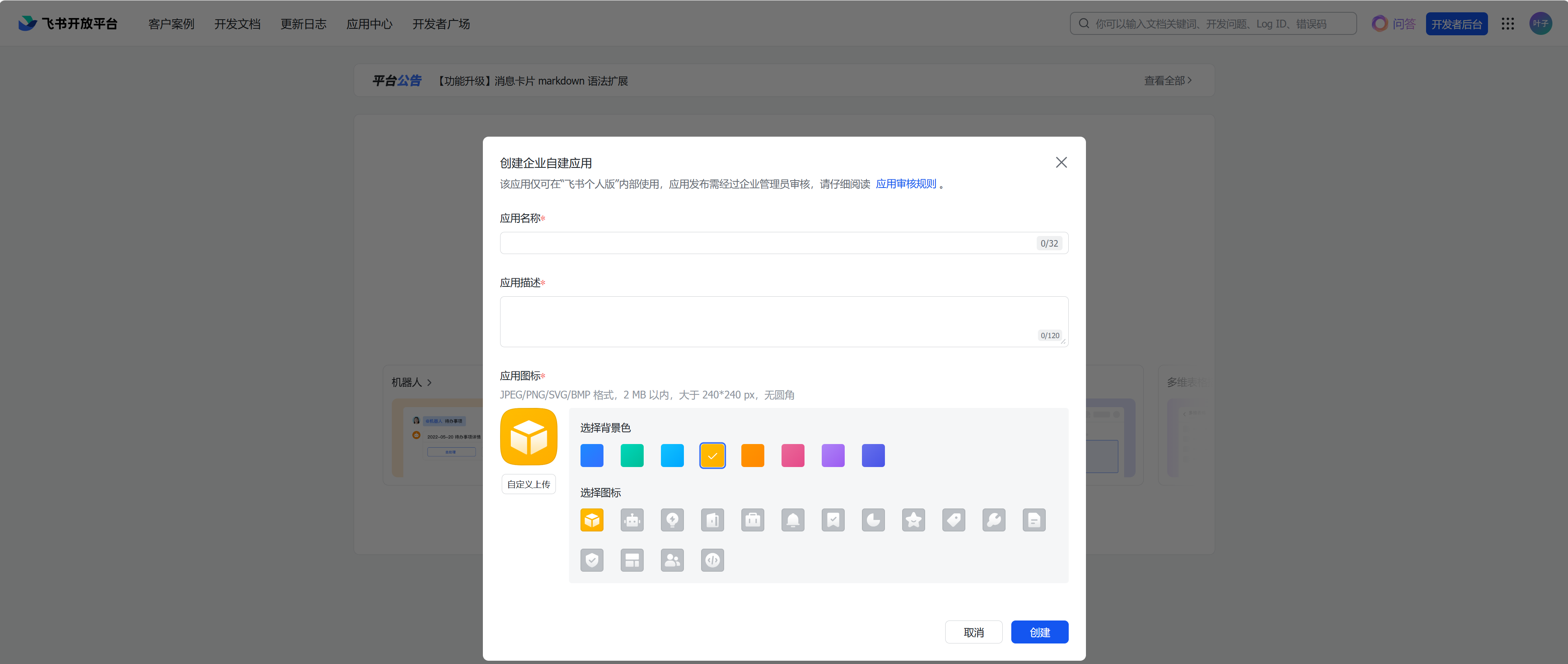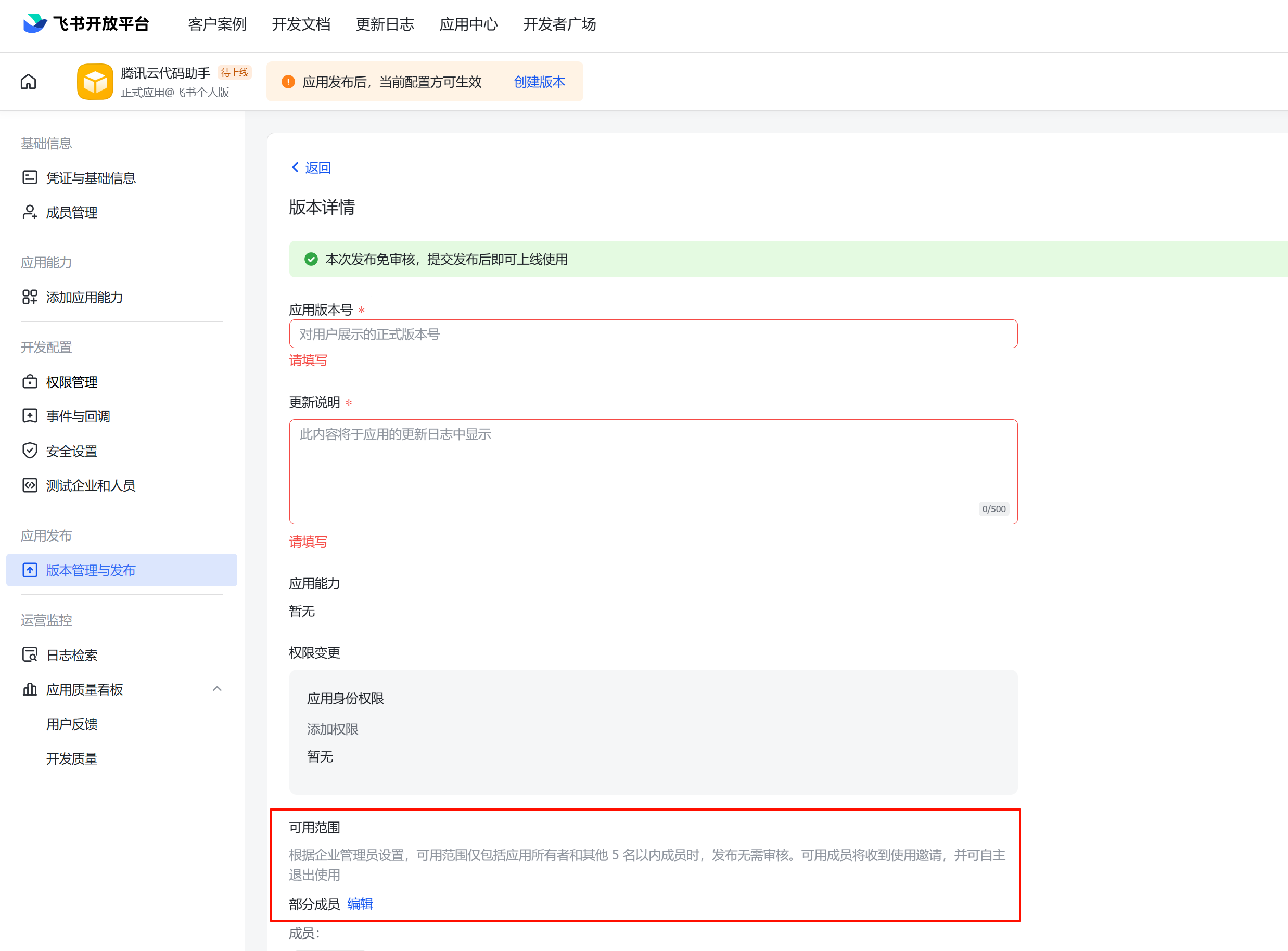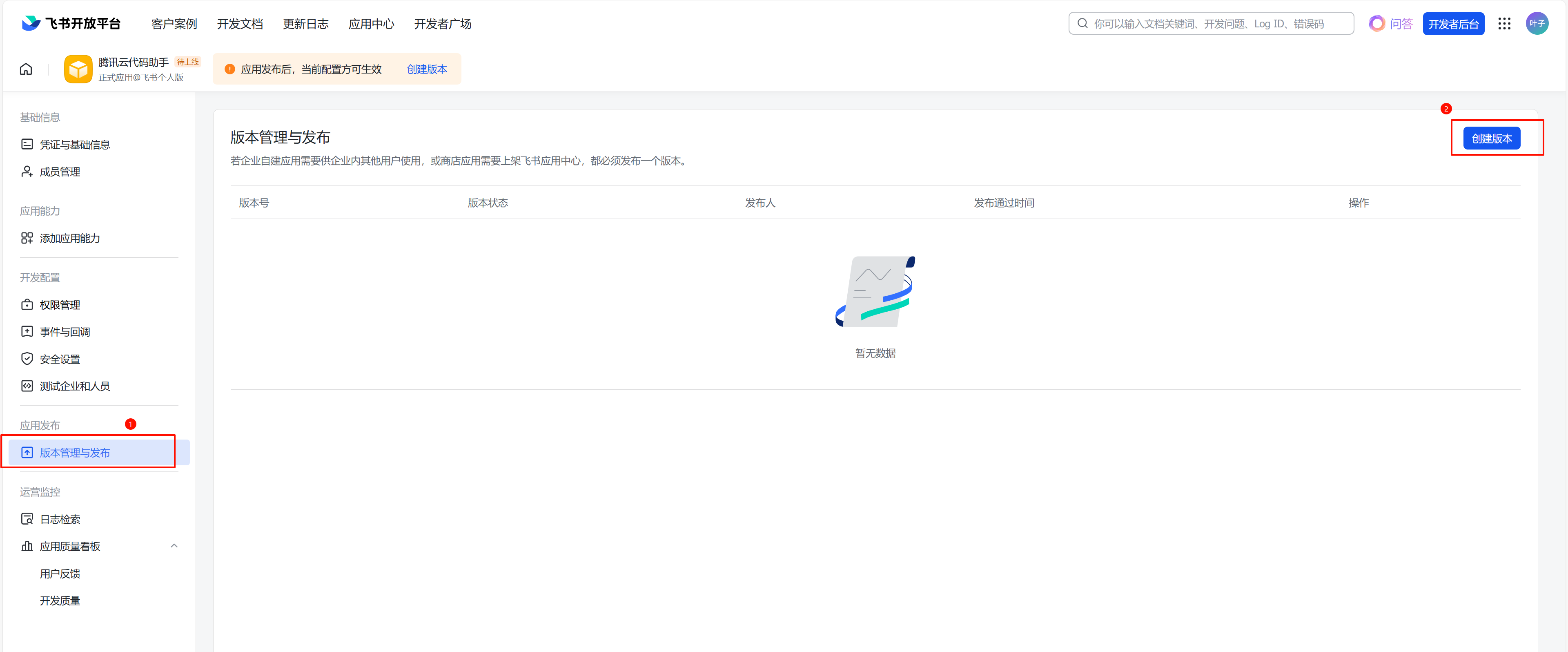 在飞书开放平台中,选择版本管理与发布菜单,单击创建版本。