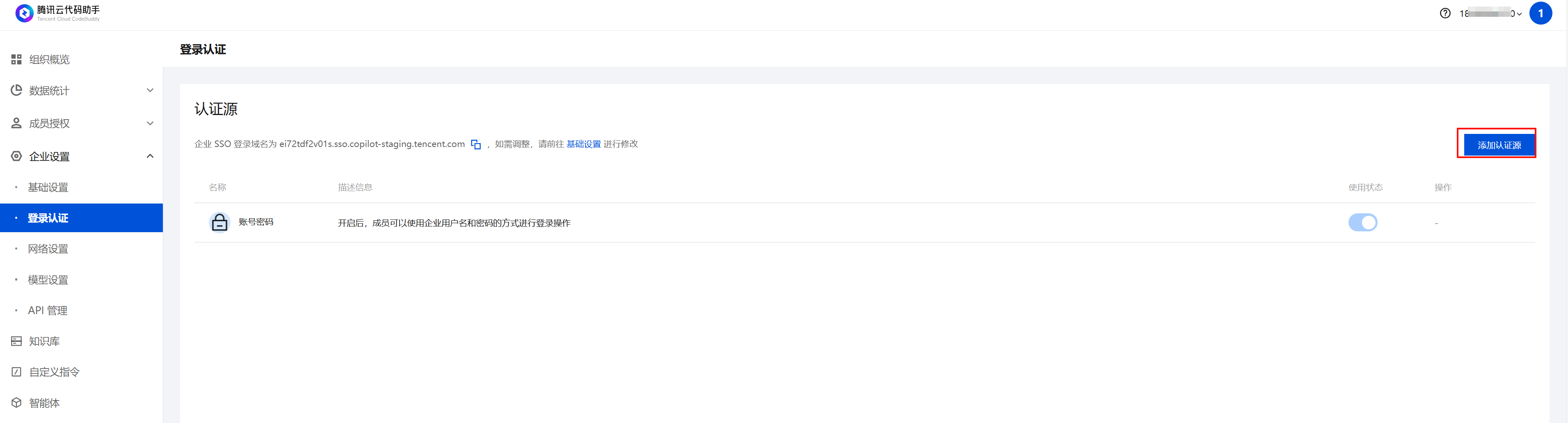 1. 进入 腾讯云代码助手管理端,选择企业设置 > 登录认证,单击添加认证源。