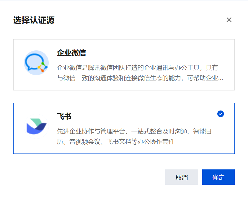 认证源集成需选择企业专属认证账号,当前仅新建企业支持该类账号模式,选择后无法更改,请谨慎操作。