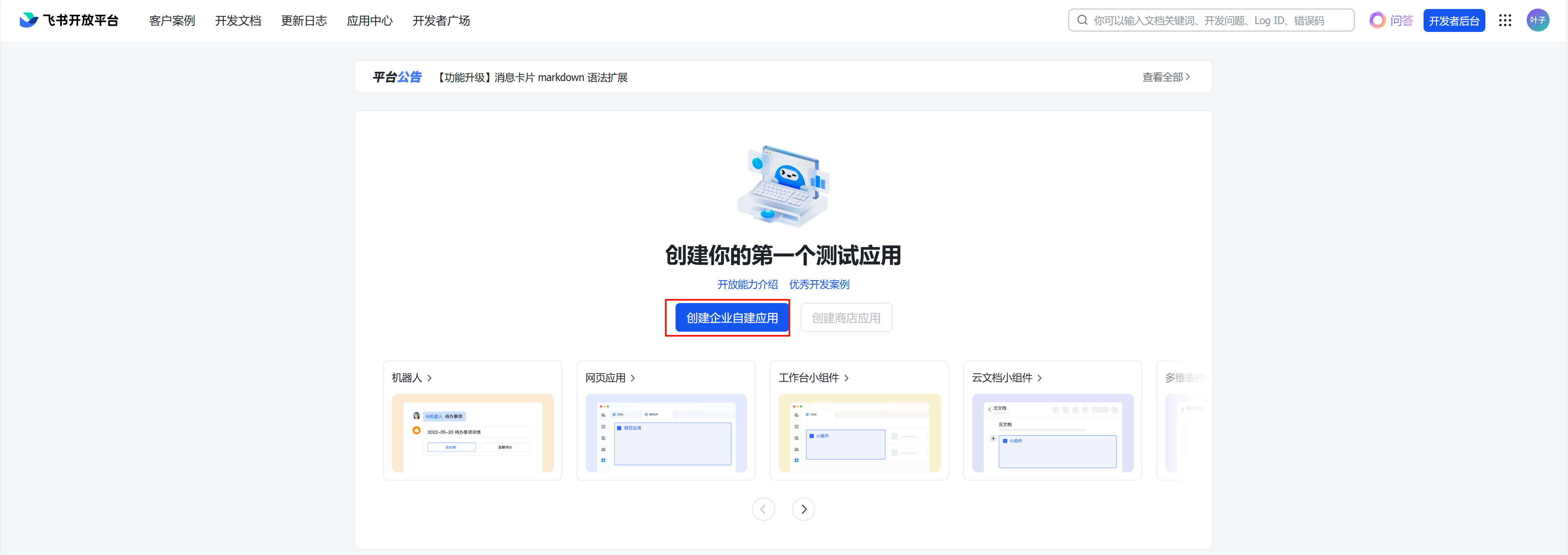 配置飞书认证源需要在 飞书开放平台 上通过自建应用来完成,您可以按下图指引操作,或参见 飞书-企业自建应用开发流程