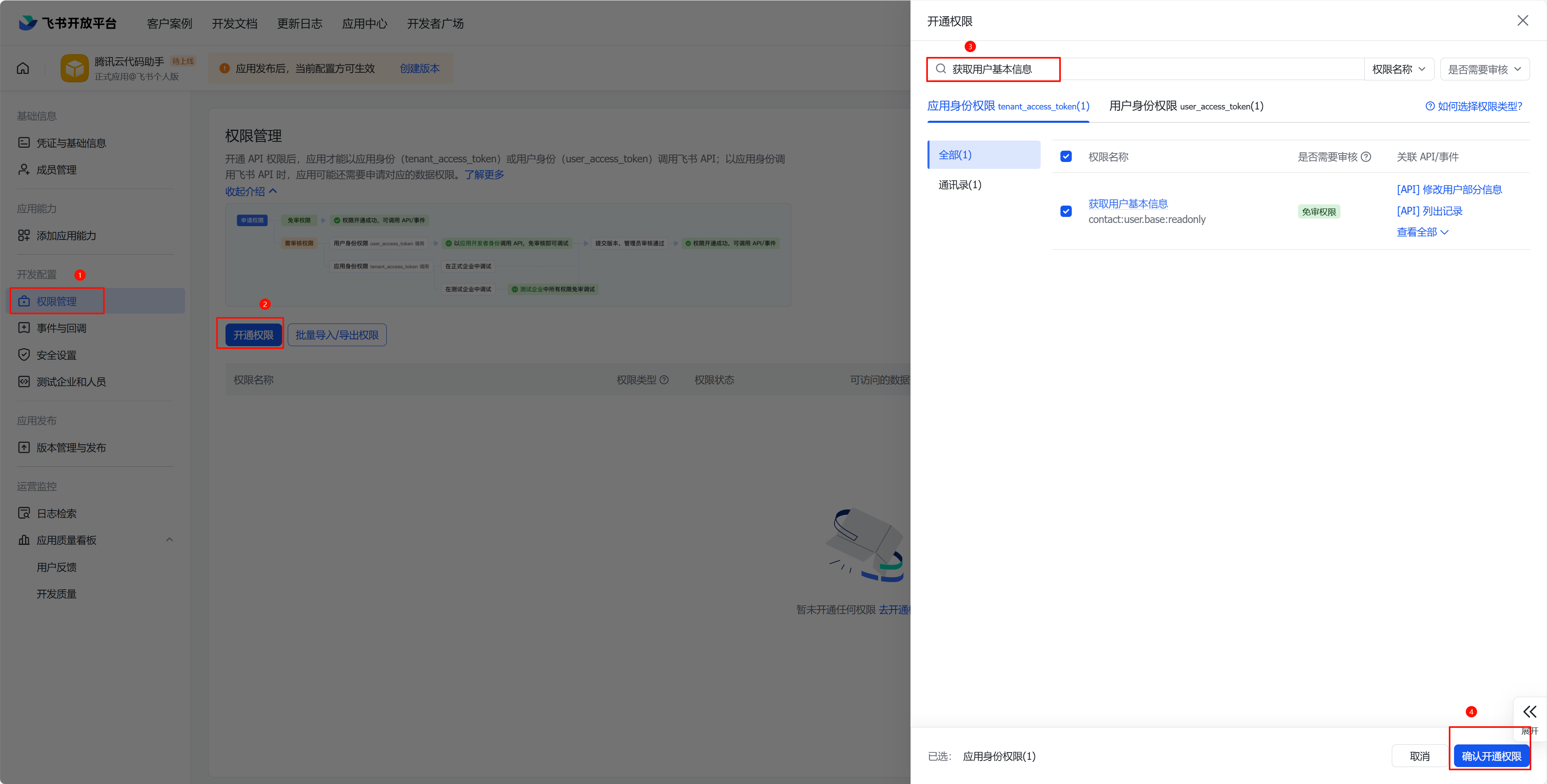权限开通流程见下图,在飞书开放平台中,进入权限管理,在 API 权限中,搜索权限信息并开通。