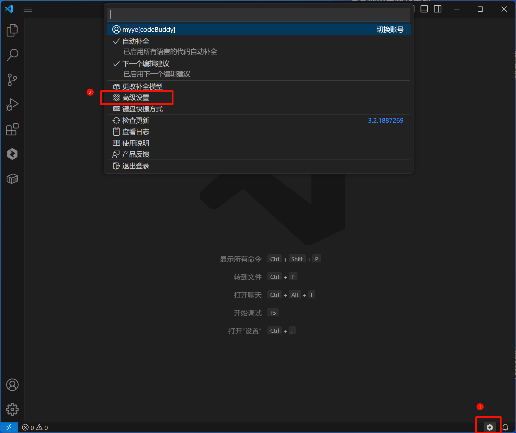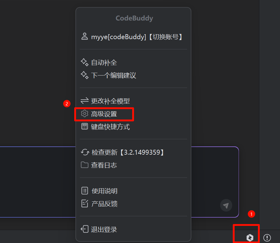 单击底部腾讯云代码助手的 icon 按钮,在弹出菜单中选择高级设置进入。