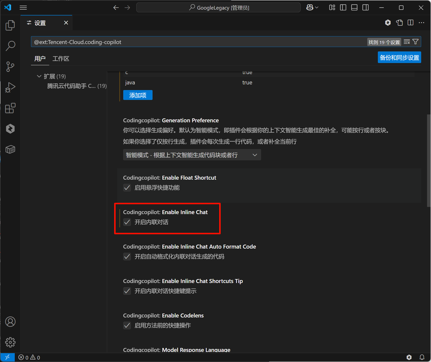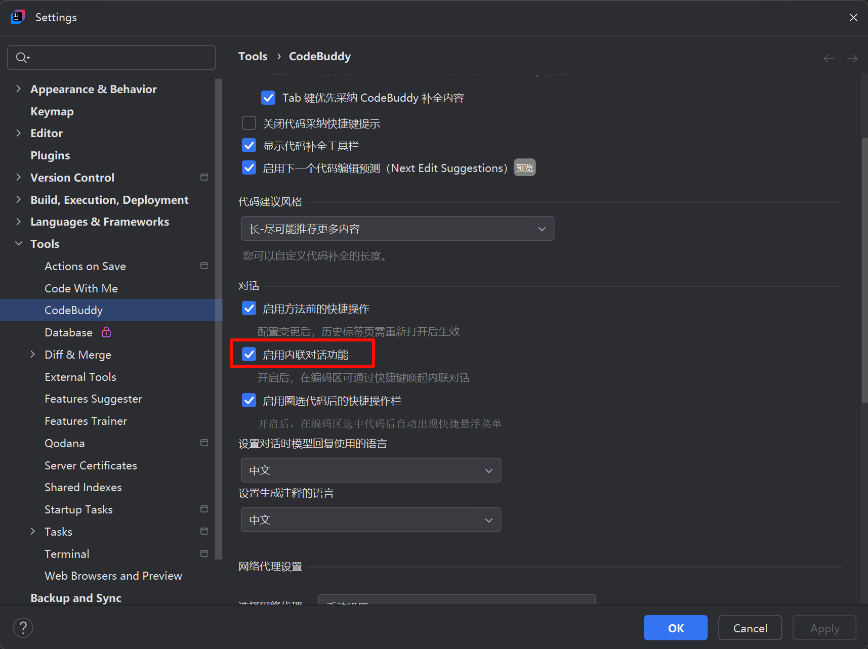 确认启用内联对话功能已开启。