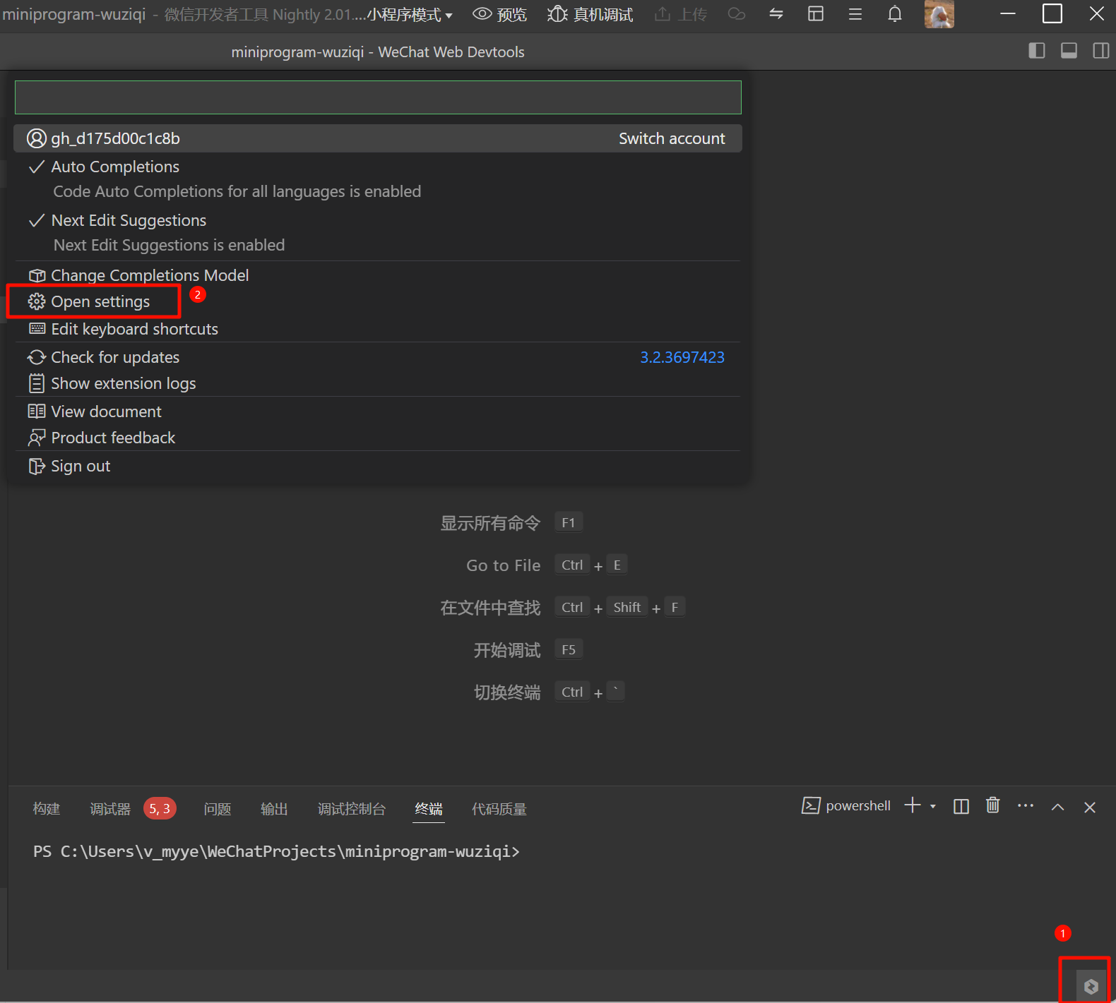 单击底部腾讯云代码助手的按钮,弹出菜单条,选择高级设置进入。