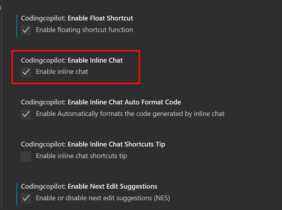 确认 Enable Inline Chat 已经开启。