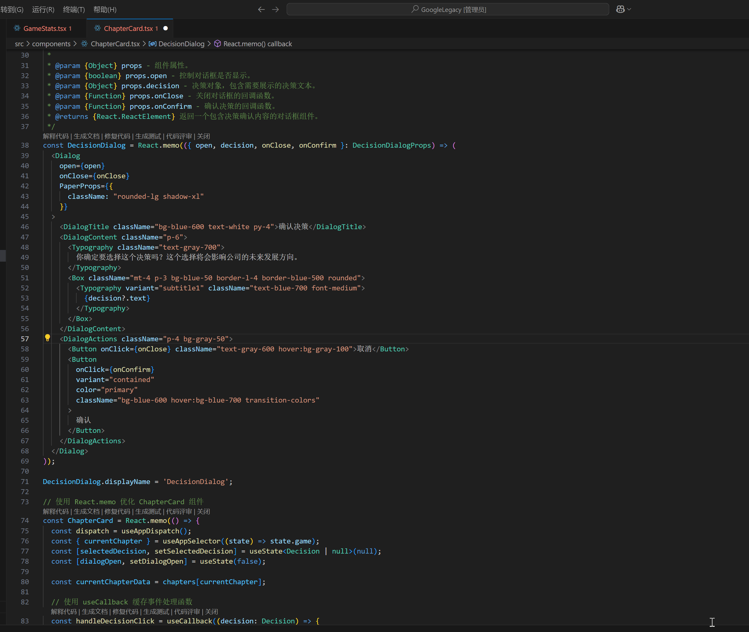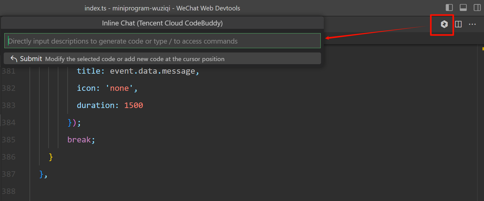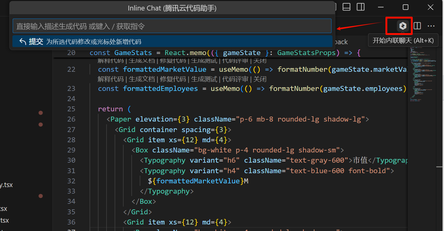 在编辑区的右上方,单击腾讯云代码助手的 icon 图标,可唤起内联对话功能。