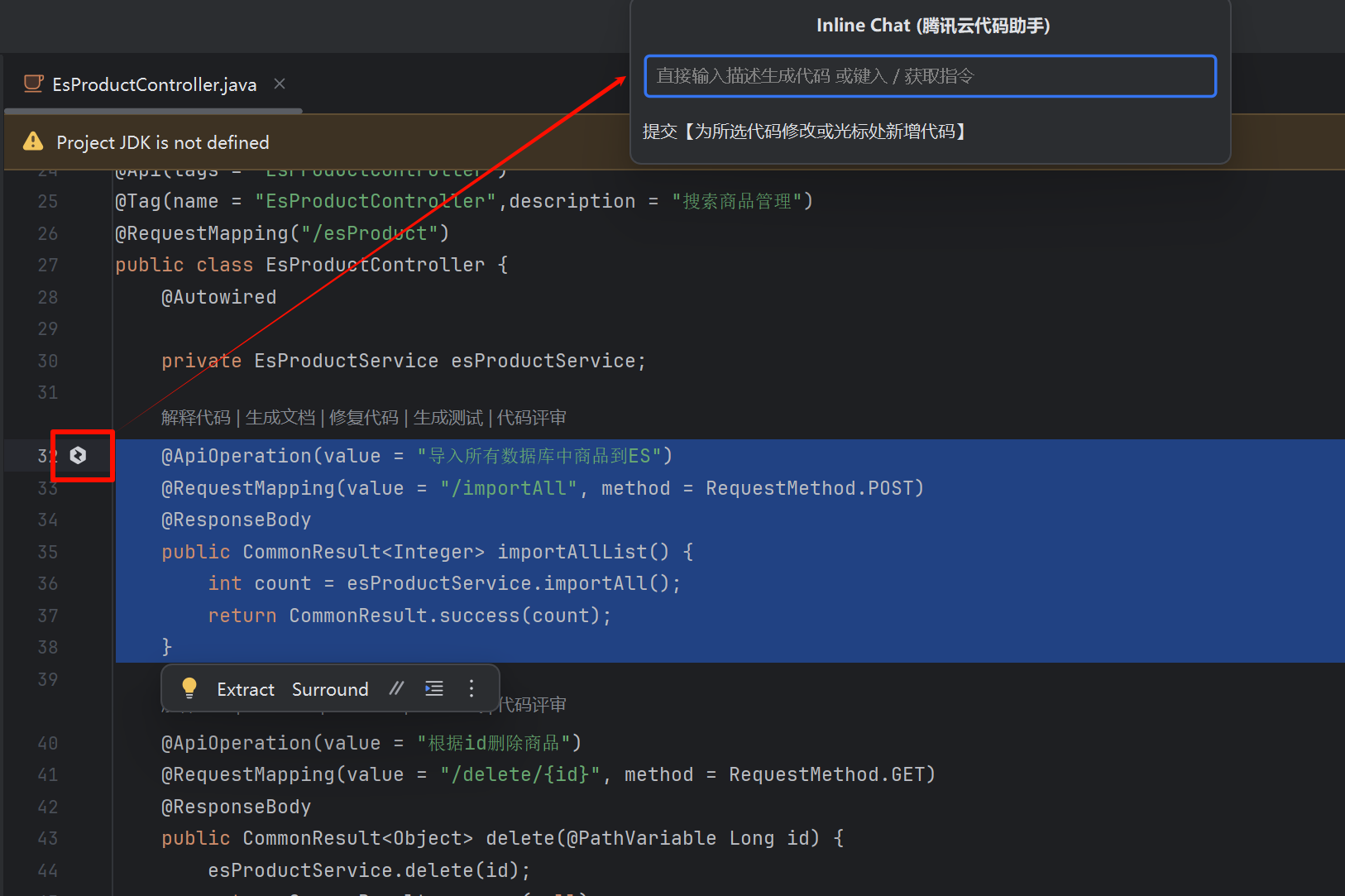 圈选代码区域后,在侧边弹出腾讯云代码助手的 icon 图标,单击可唤起内联对话功能。