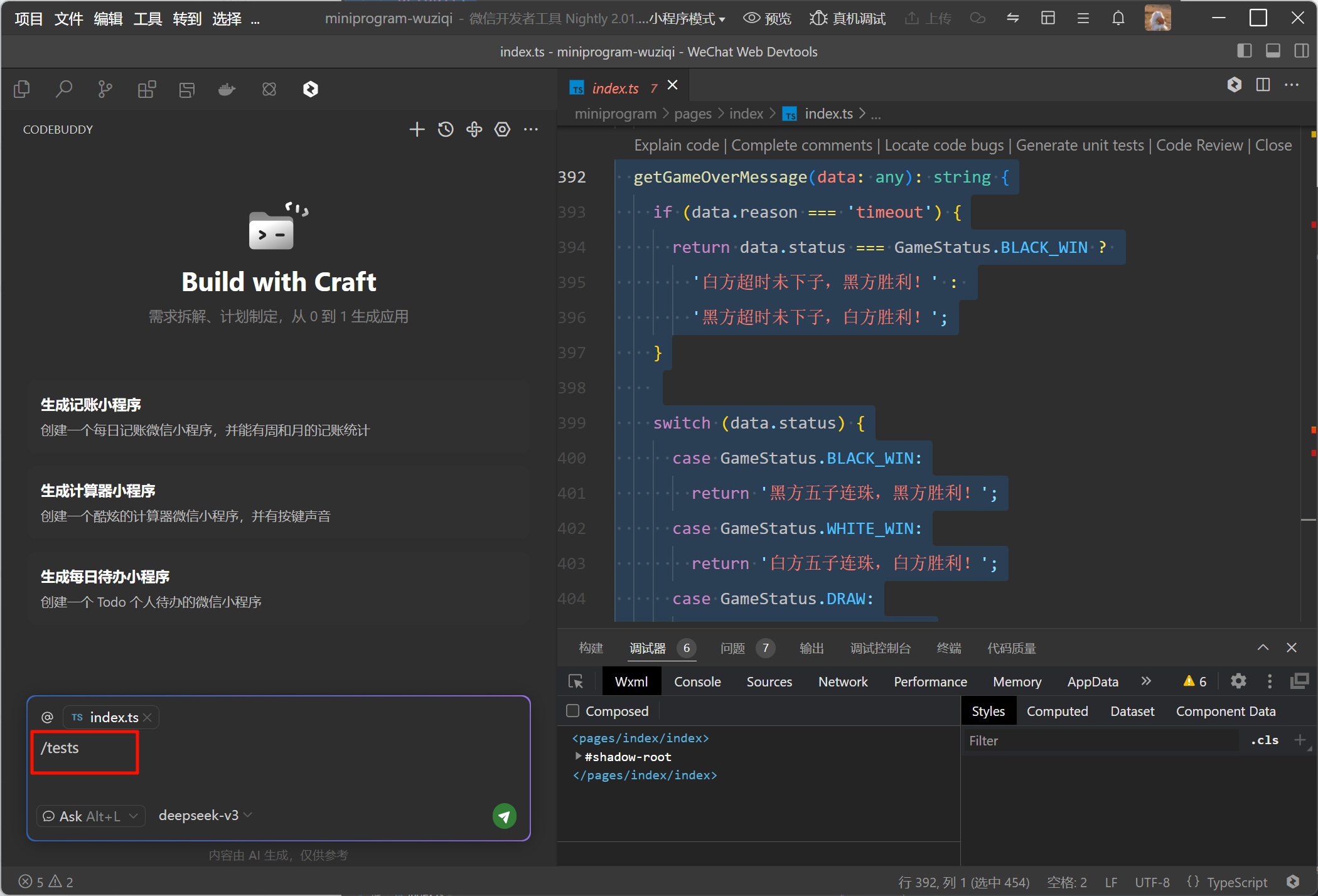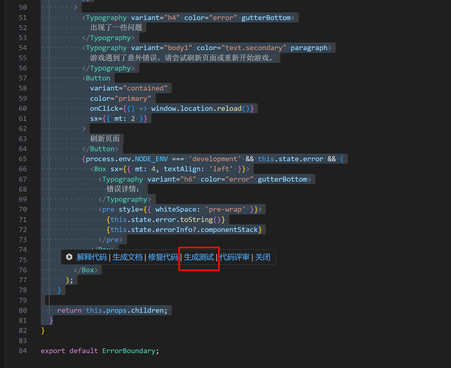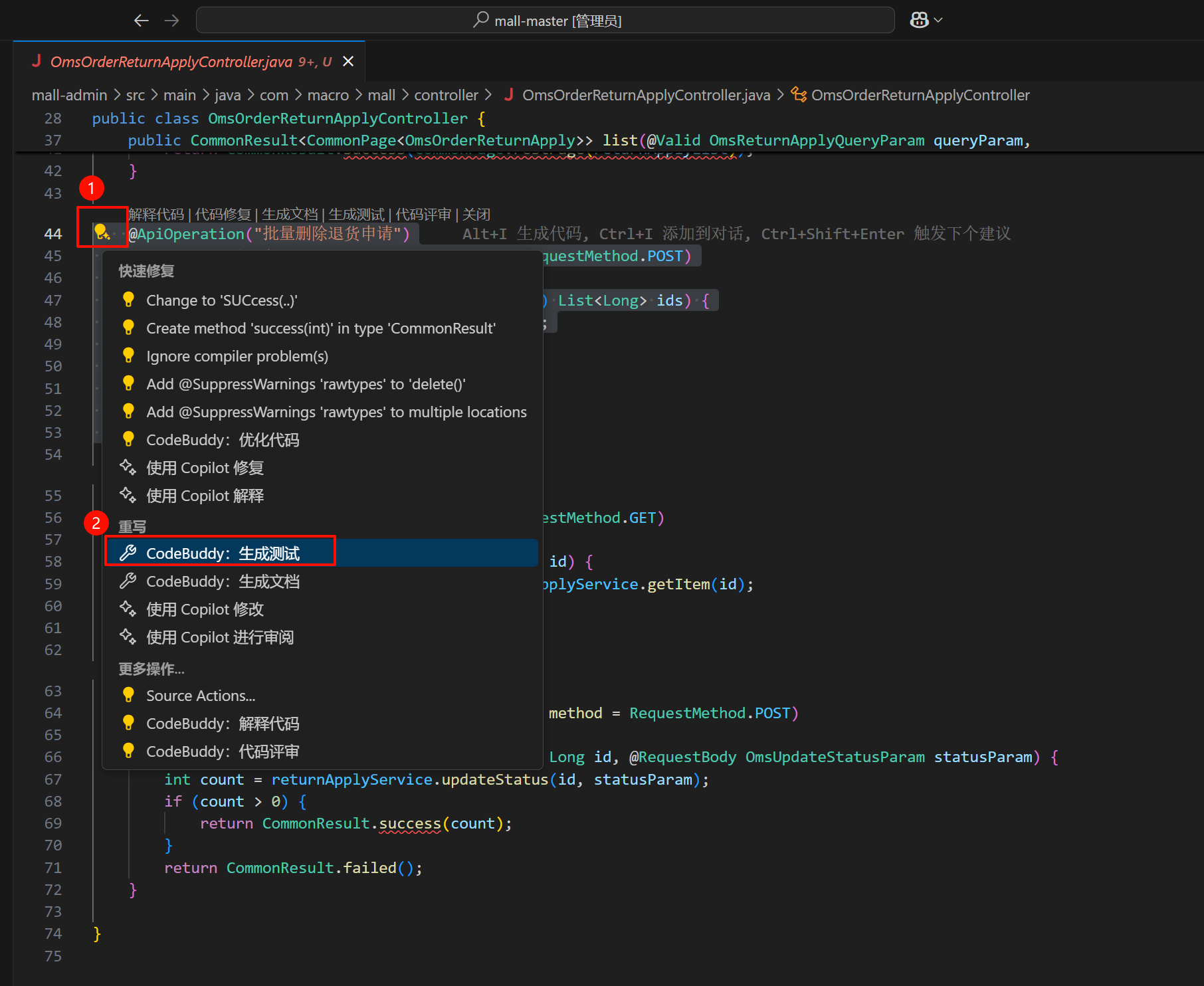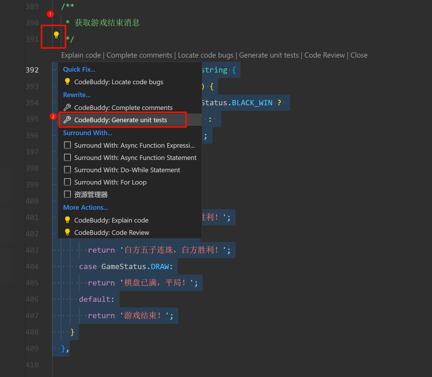 圈选代码后,单击显示操作的小灯泡,选择 CodeBuddy:生成测试。