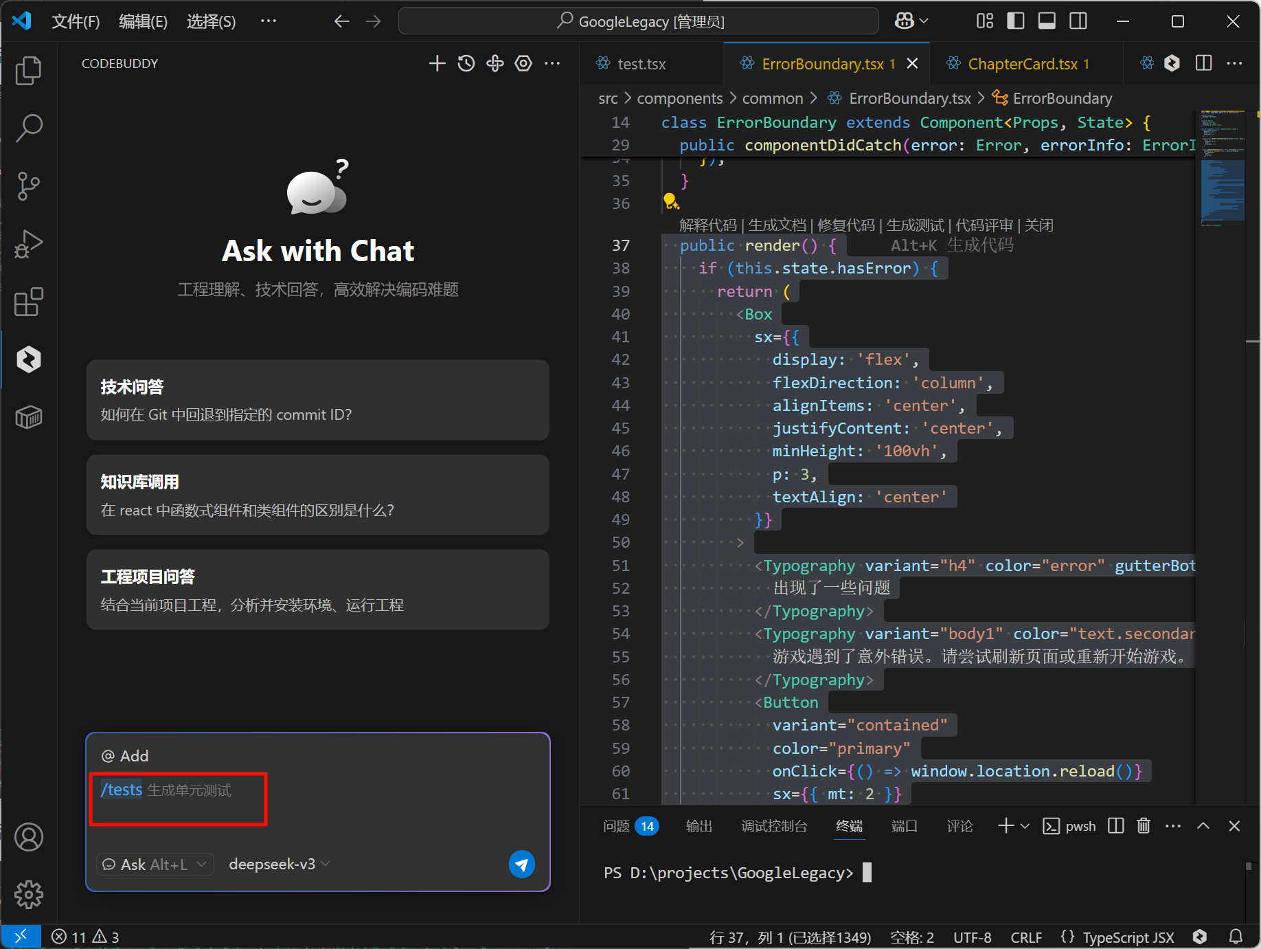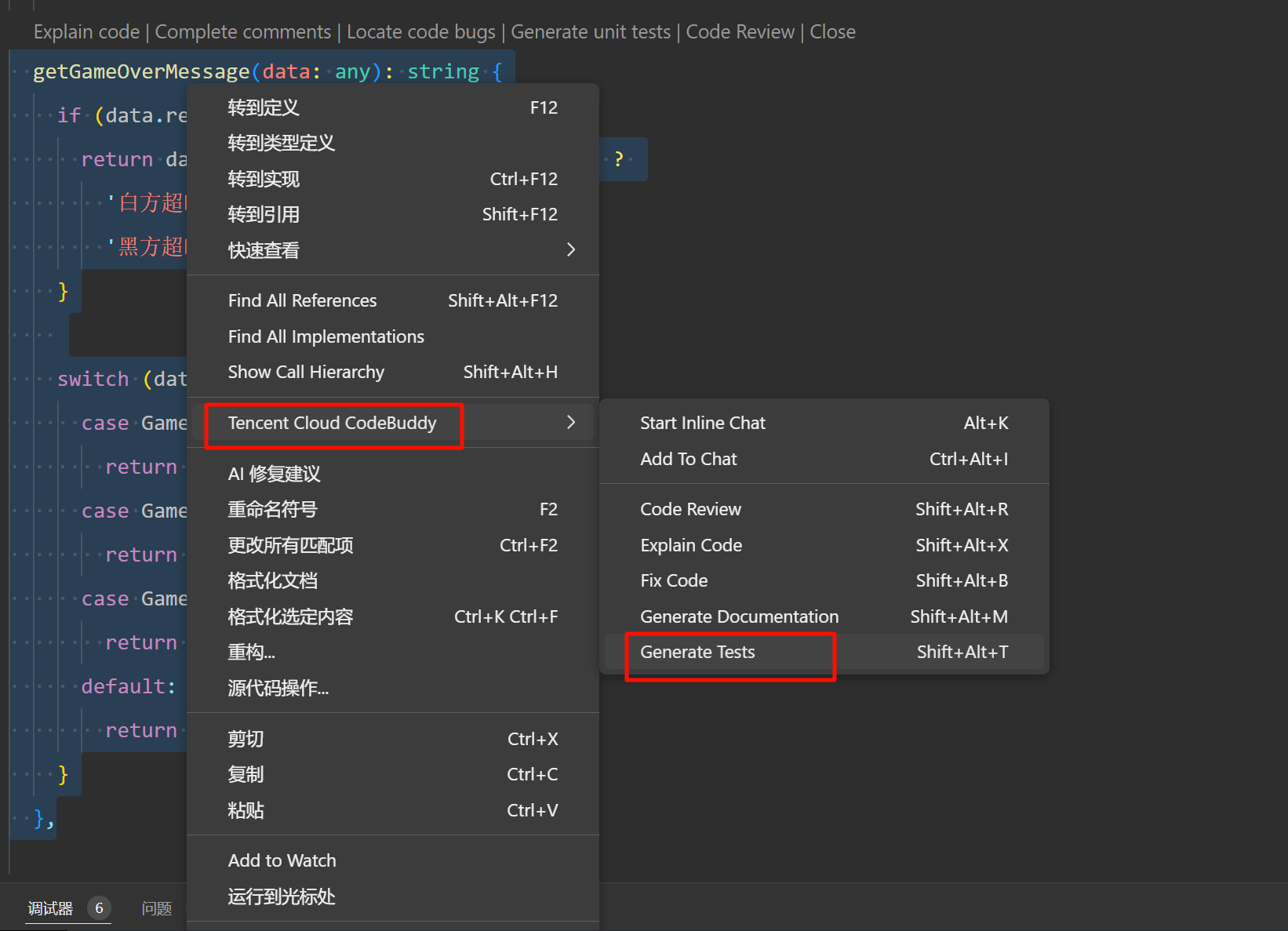 圈选代码后,右键选择腾讯云代码助手 CodeBuddy > 生成测试。