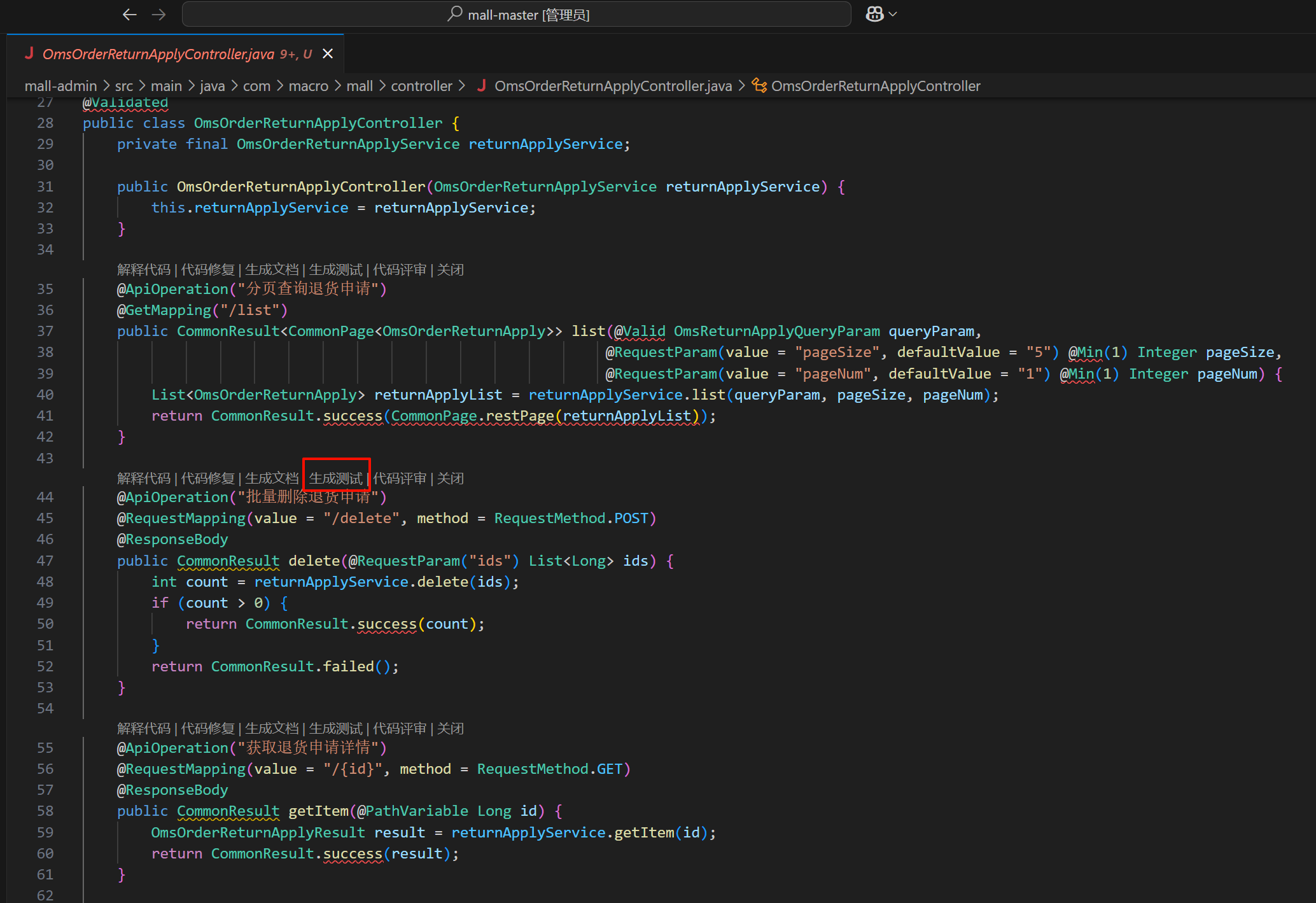 选中代码后,将鼠标悬浮圈选代码后出现功能面板,选择生成测试。