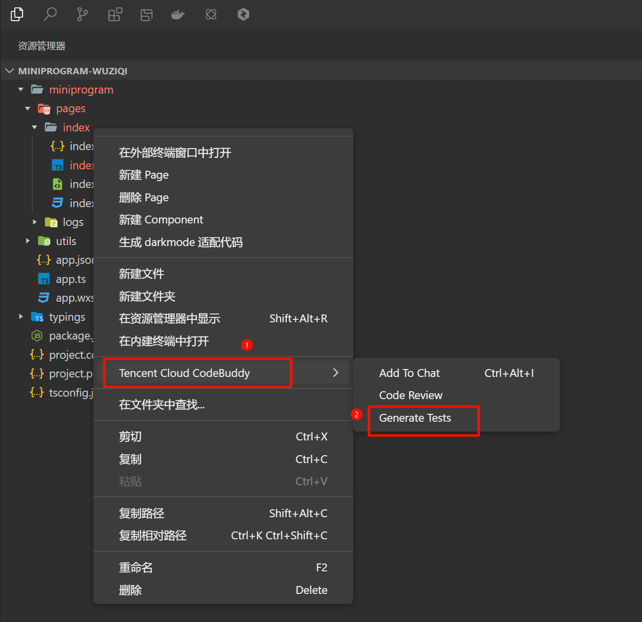在资源管理器的文件树中,可以右键选择 CodeBuddy > 生成测试。