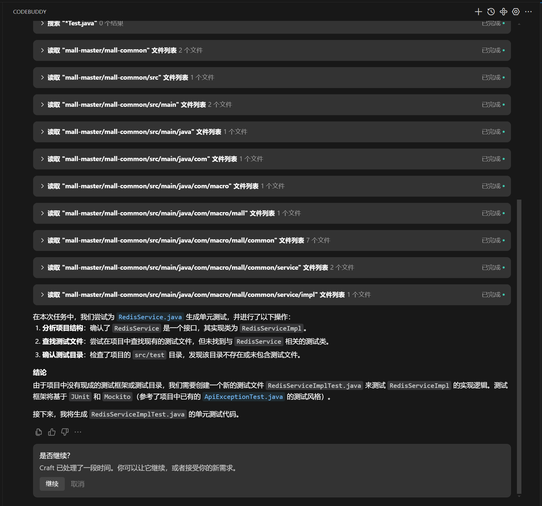 触发单元测试生成后,代码助手会先进行分析项目结构、查找现有的测试文件、确认测试目录等一系列操作。可以点击继续,让代码助手继续生成单元测试代码。