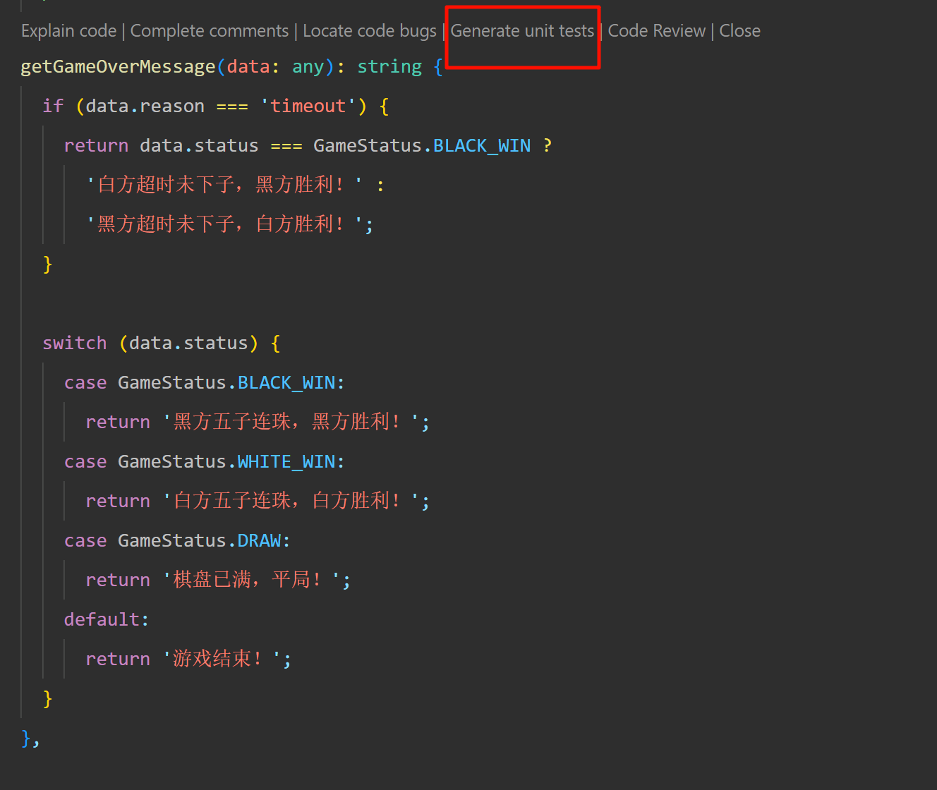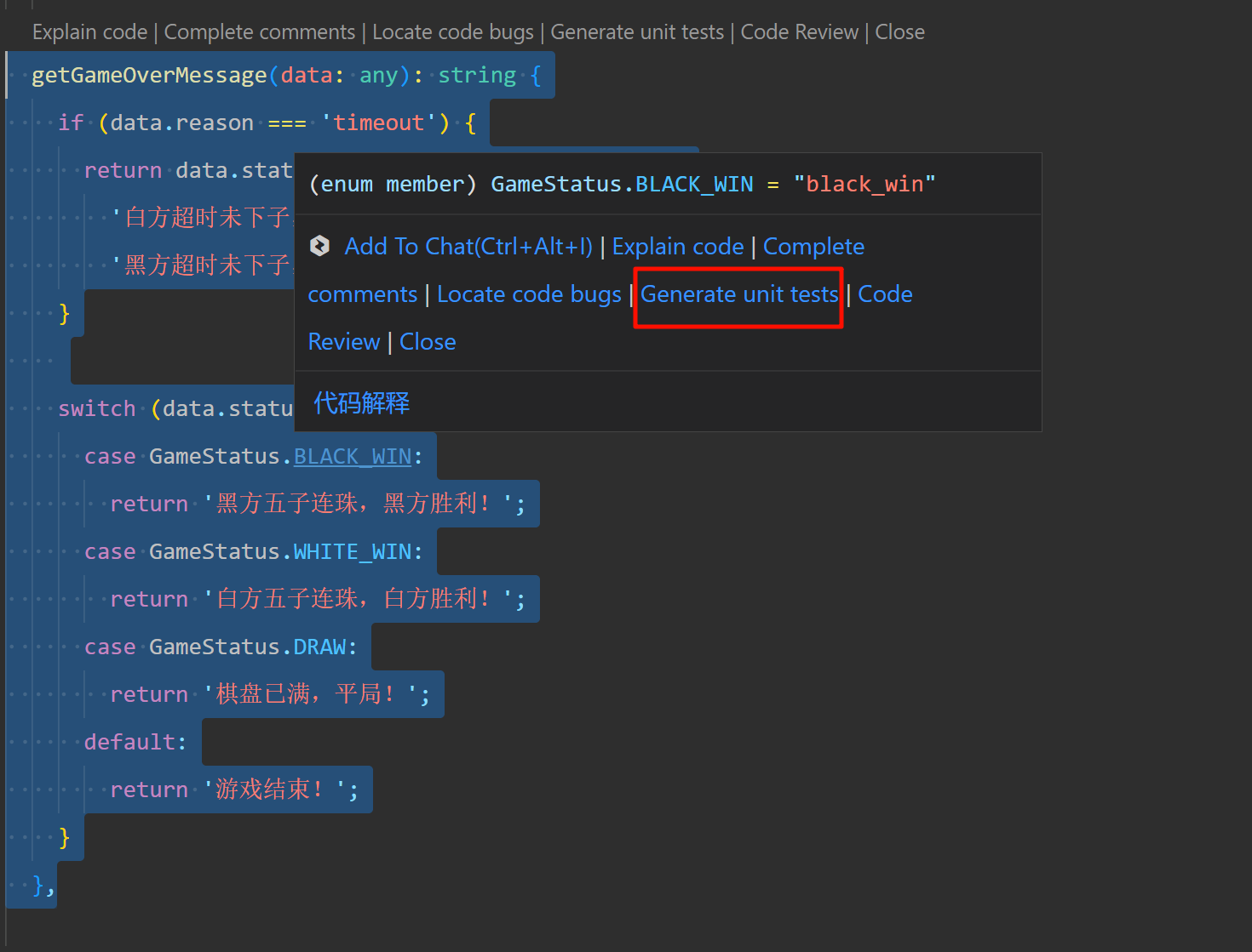 圈选代码后,将鼠标悬浮在代码上,在弹出的悬浮菜单中可以选择 Generate unit tests 触发单元测试生成。