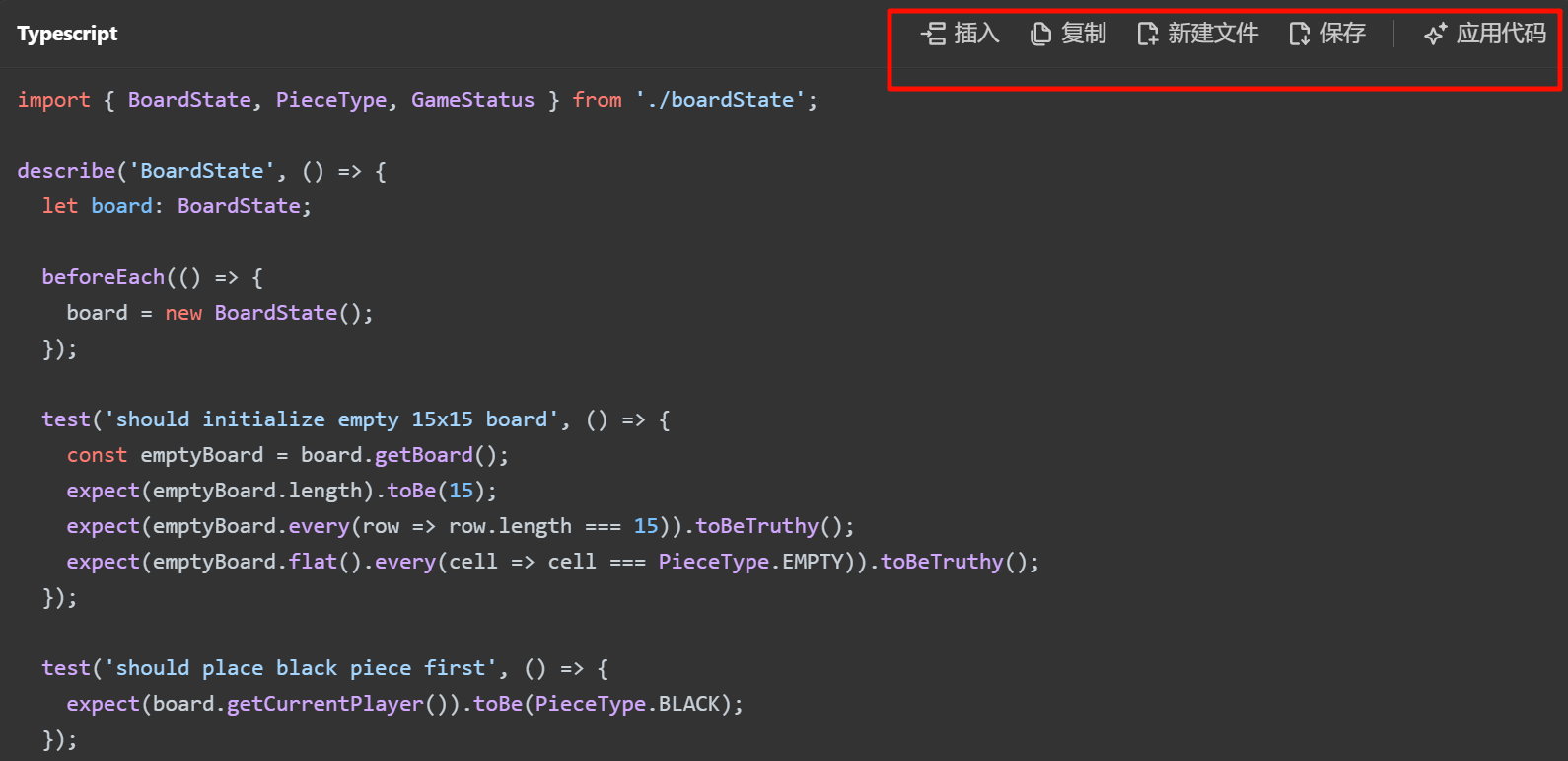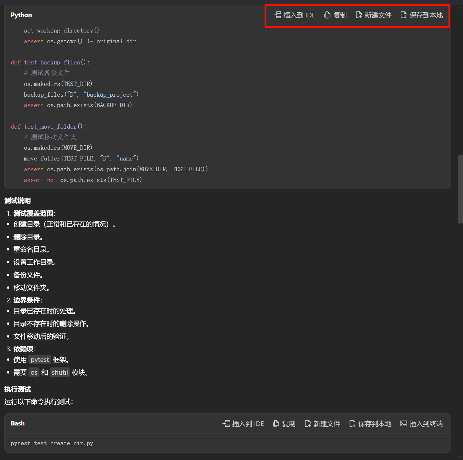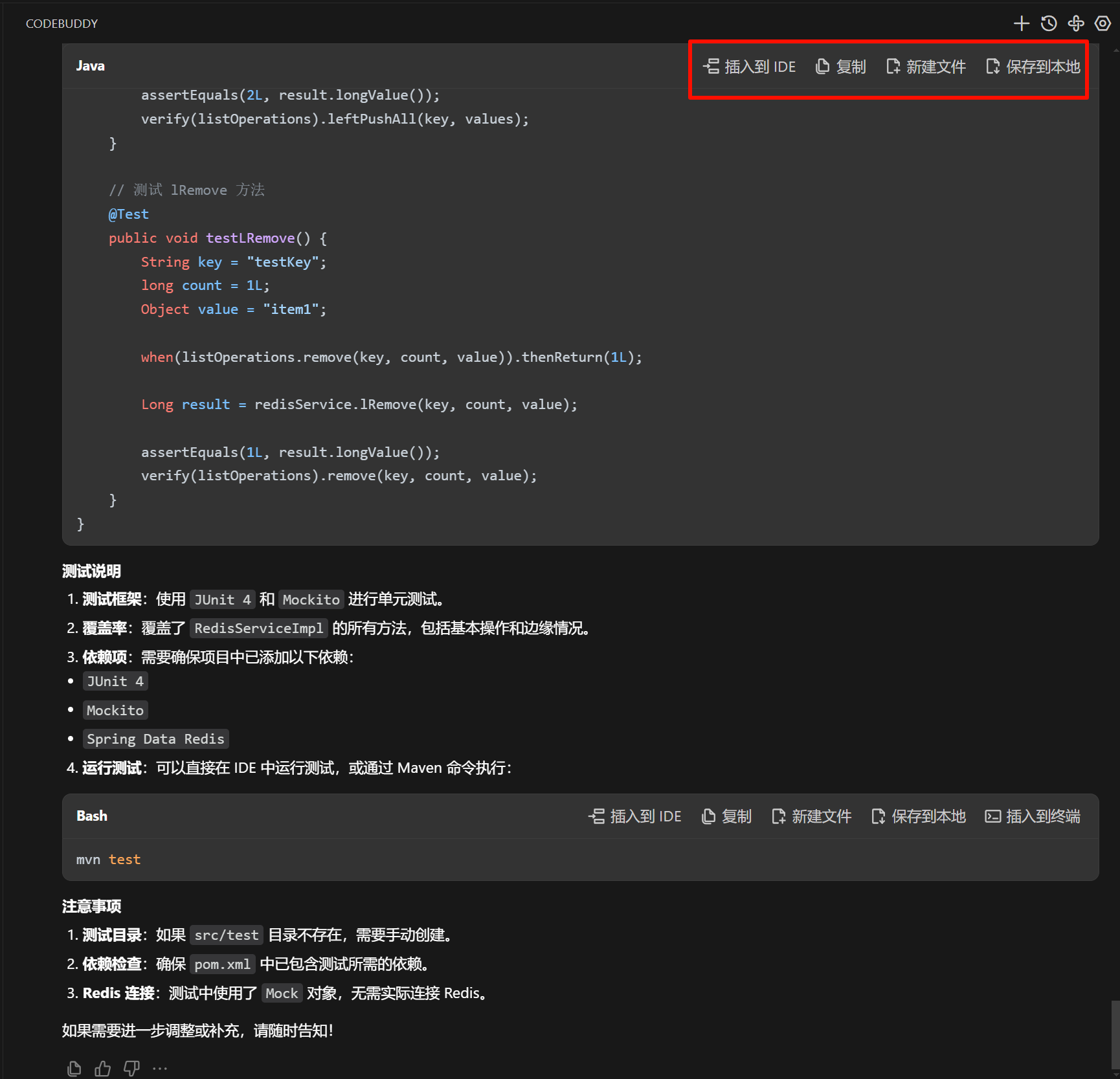 应用单元测试代码。 生成单元测试代码后,您可以根据实际情况来选择不同的应用代码方式,支持插入到 IDE、复制、新建文件以及保存到本地的方式。应用代码后,可以根据测试说明来运行测试进行验证。