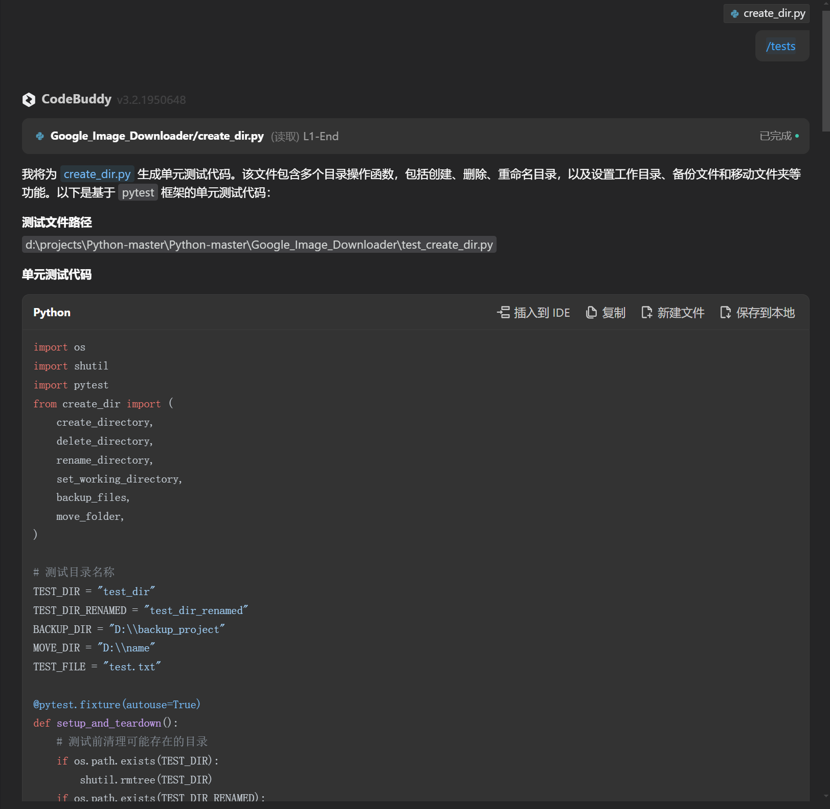触发单元测试生成后,代码助手会先对测试代码内容进行分析,并选择合适的测试框架生成单元测试代码。同时,也生成了测试说明、运行测试指令等内容,辅助进行测试。