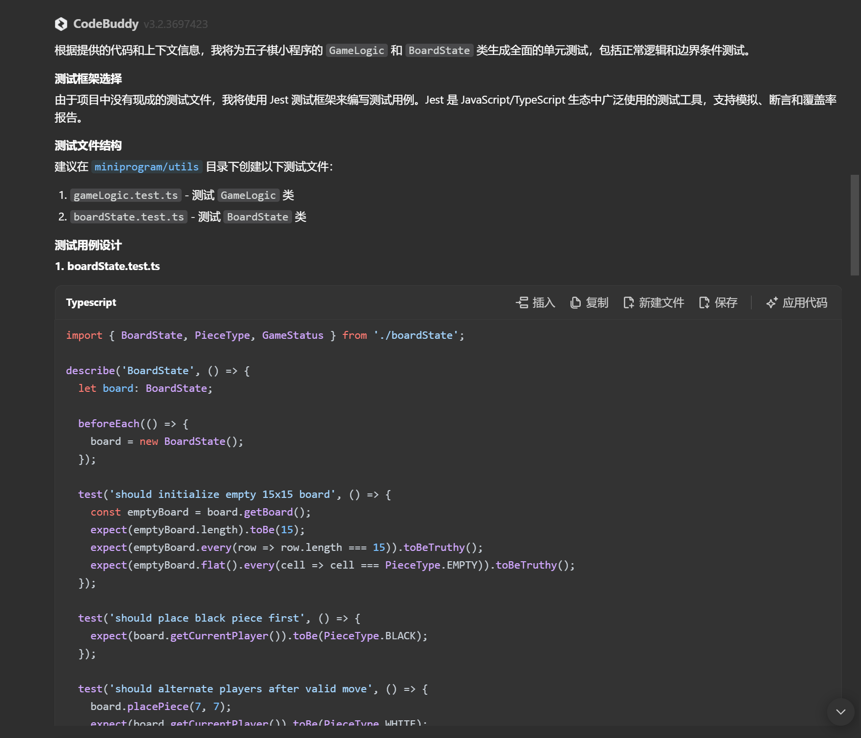 触发单元测试生成后,代码助手会先对测试代码内容和项目结构进行分析,并选择合适的测试框架生成单元测试代码。同时,也生成了测试覆盖范围、执行建议等内容,辅助进行测试。