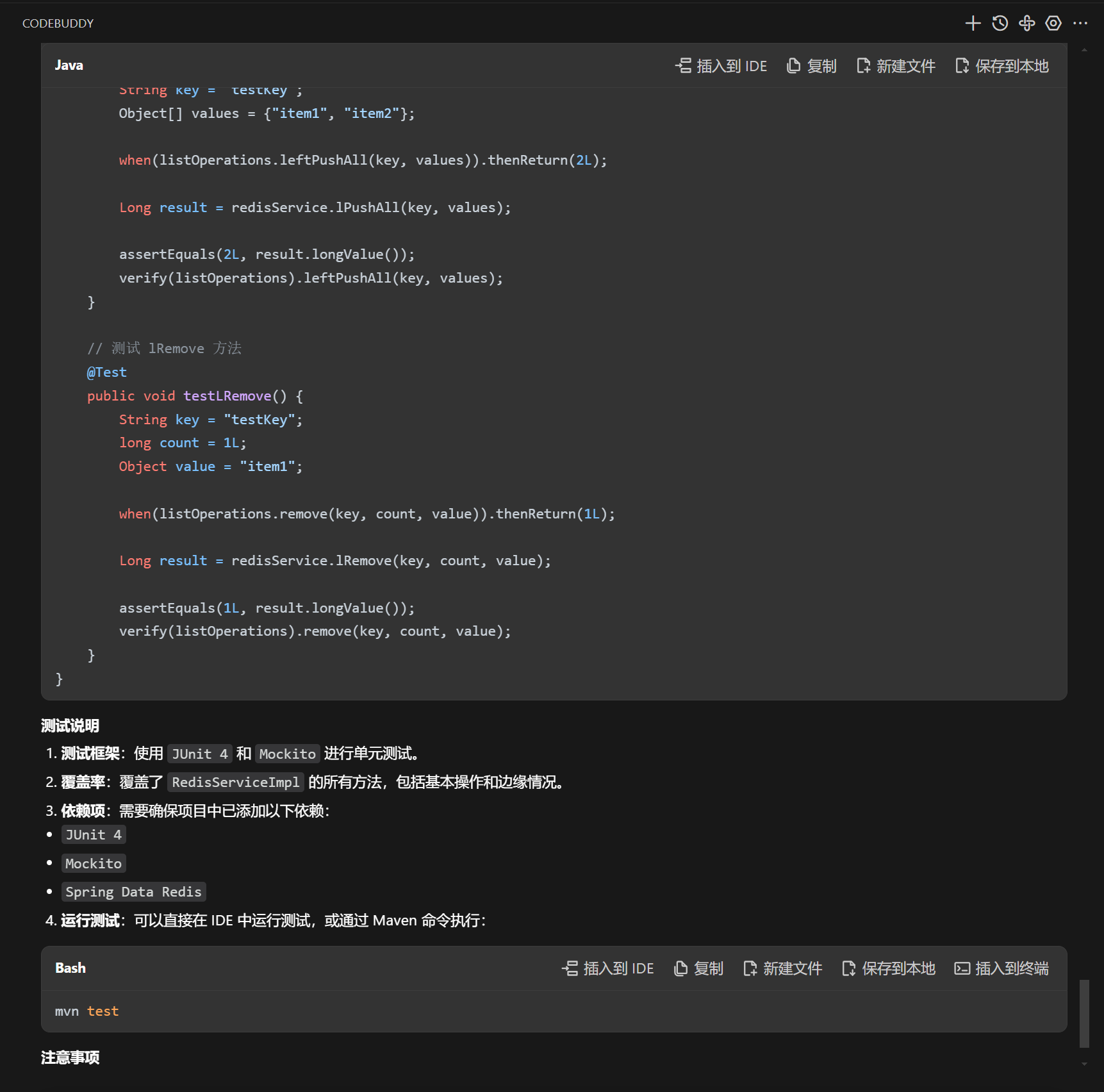 基于对所需测试代码内容的分析后,生成了完整的单元测试代码。此外,还提供了测试说明,以及注意事项等内容,辅助进行测试。