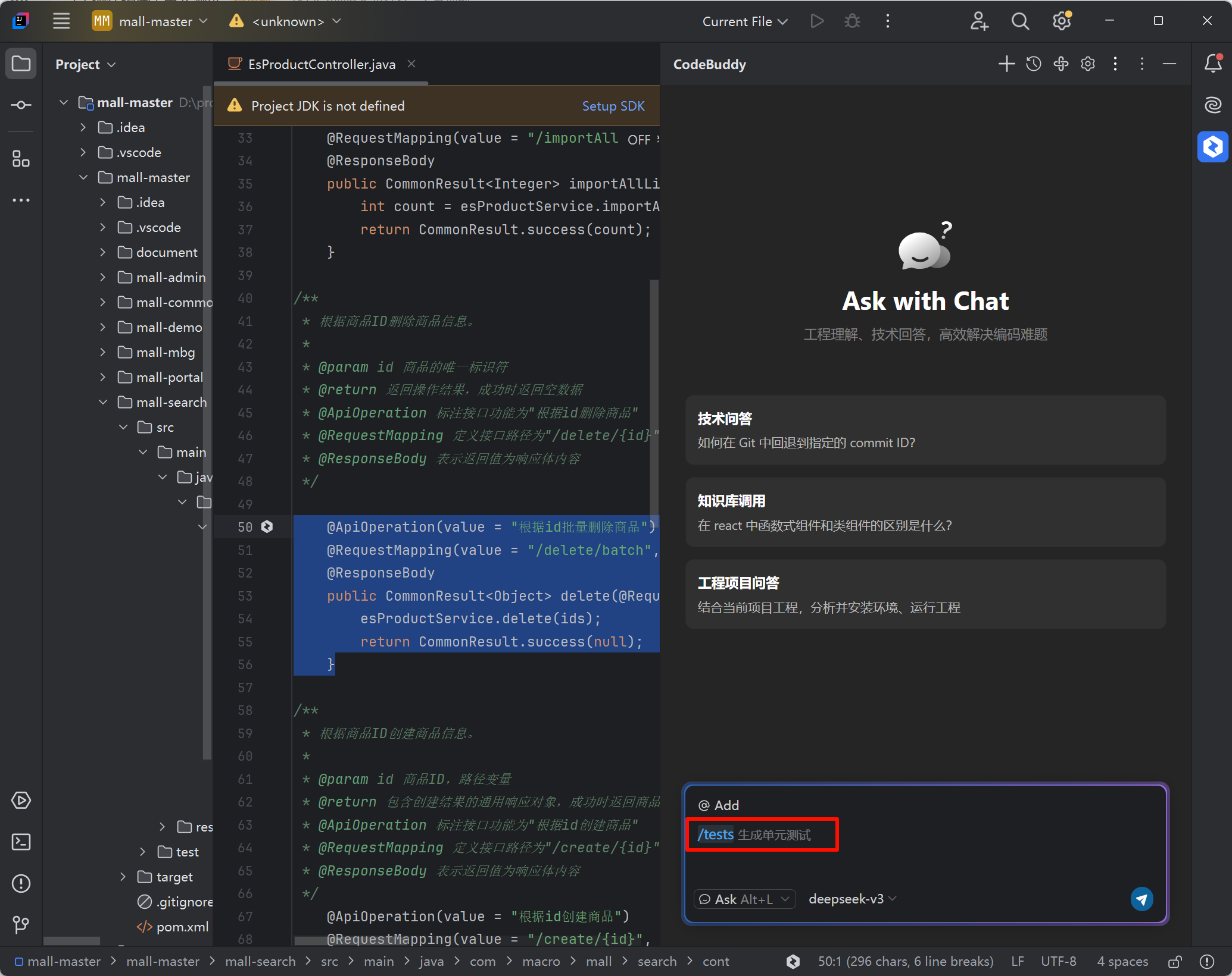 圈选代码后,右键选择 CodeBuddy > 生成测试 直接触发单元测试生成。