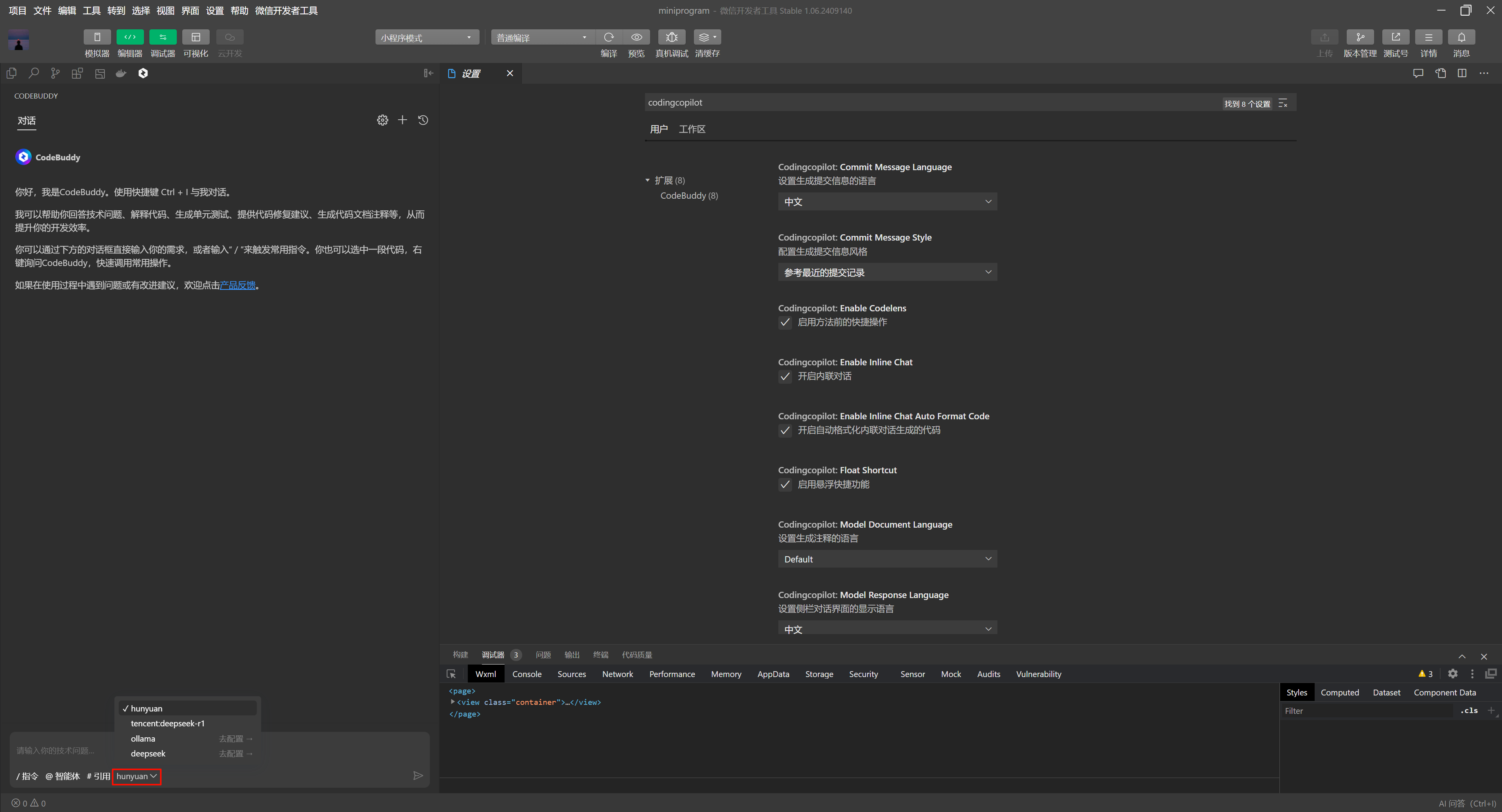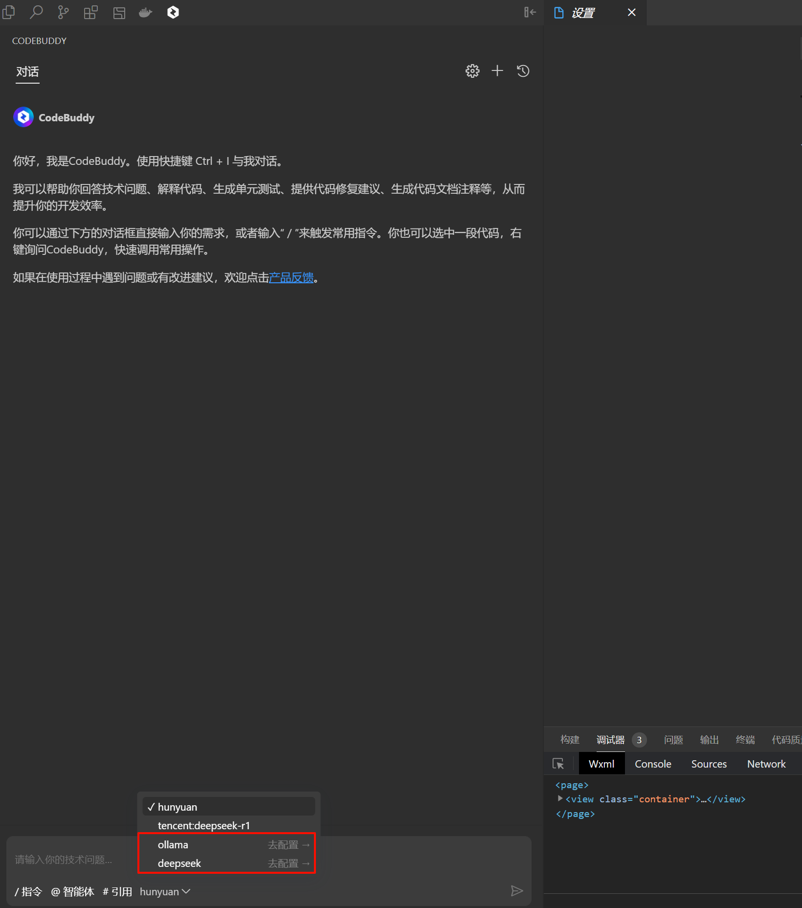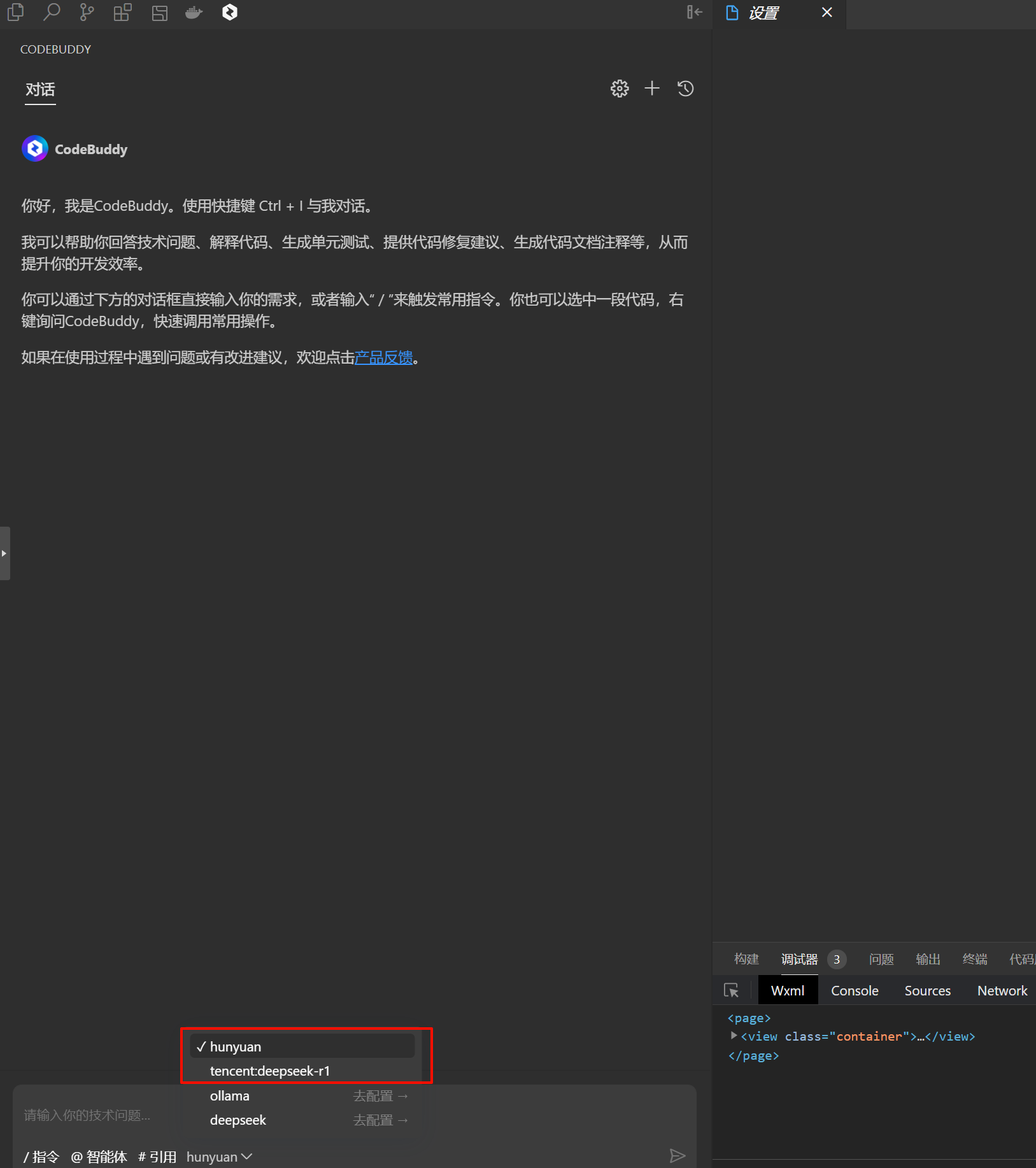 在微信小程序开发者工具 IDE 中,腾讯云代码助手已经支持对话大模型的接入和切换,对话大模型包括腾讯部署的混元大模型、DeepSeek 大模型,以及其它可自定义接入的大模型。