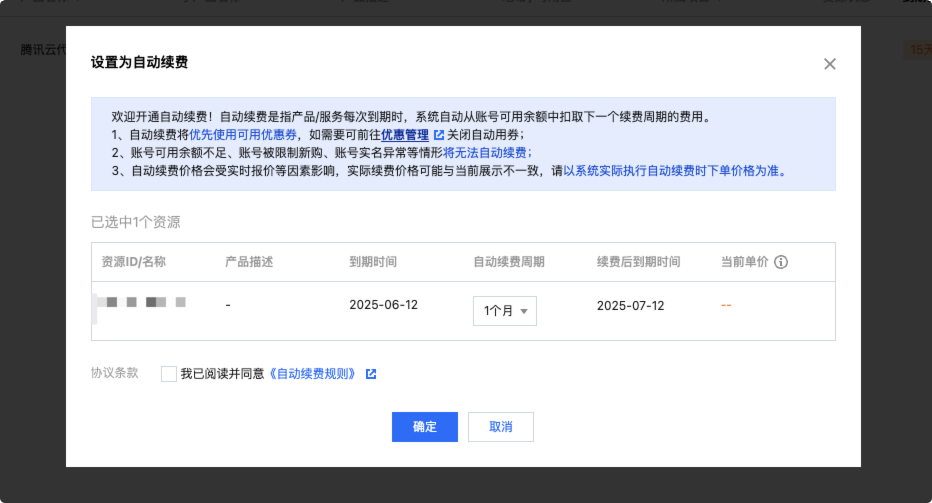 选择自动续费周期,勾选协议条款后单击确定即可。