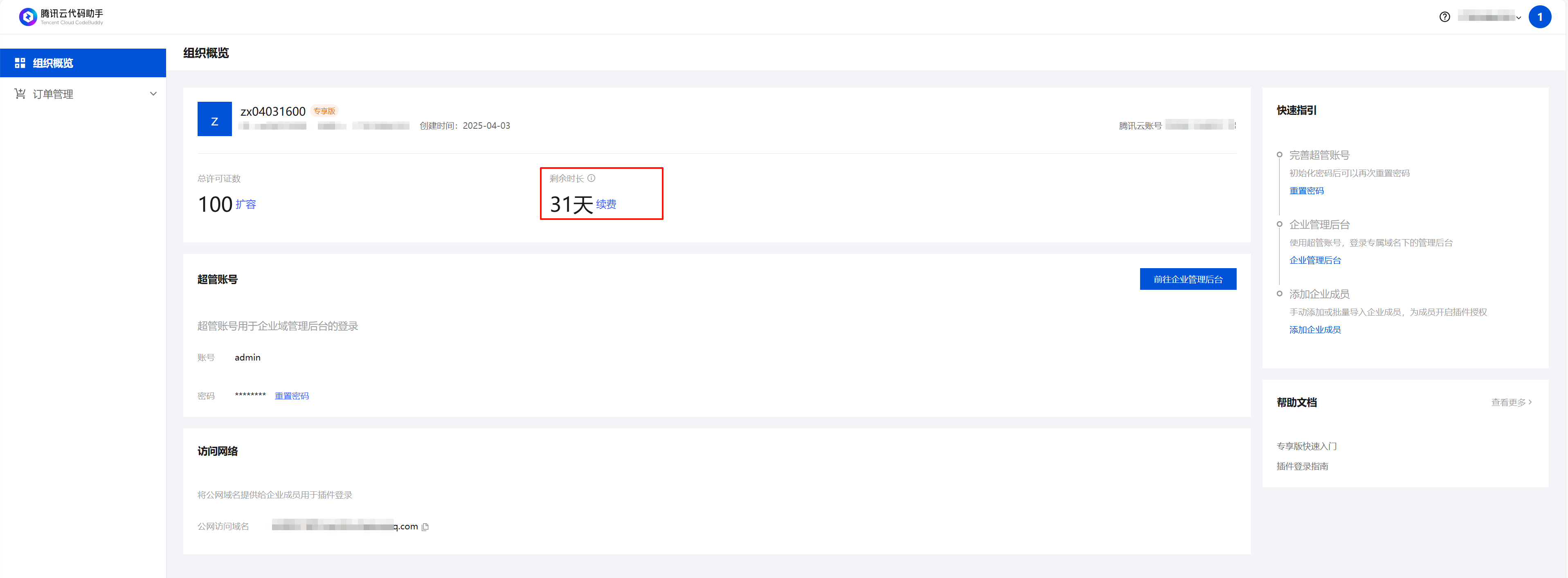 购买完成后,返回 企业后台,确认剩余时长是否正确增加。