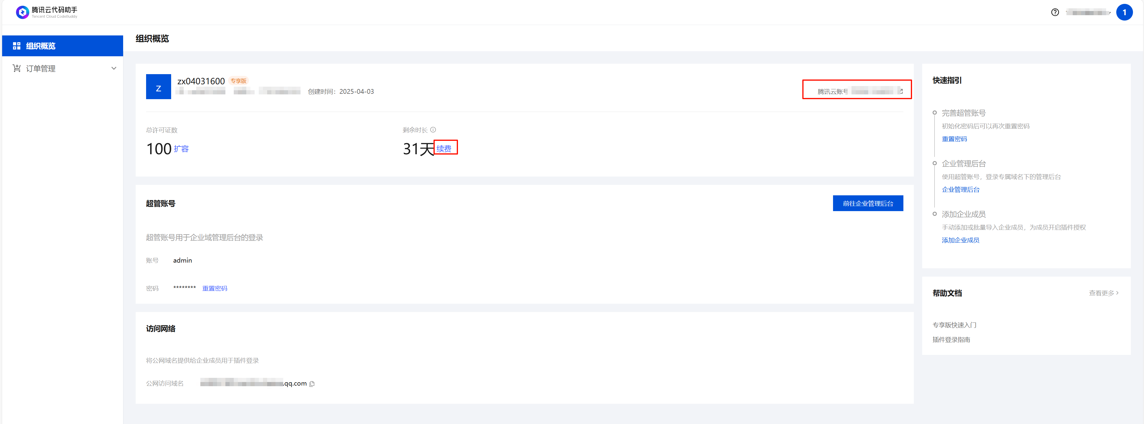 - 请使用购买企业的腾讯云账号进行续费(在企业概览中可查看腾讯云账号 uin),若账号有误,请重新登录。