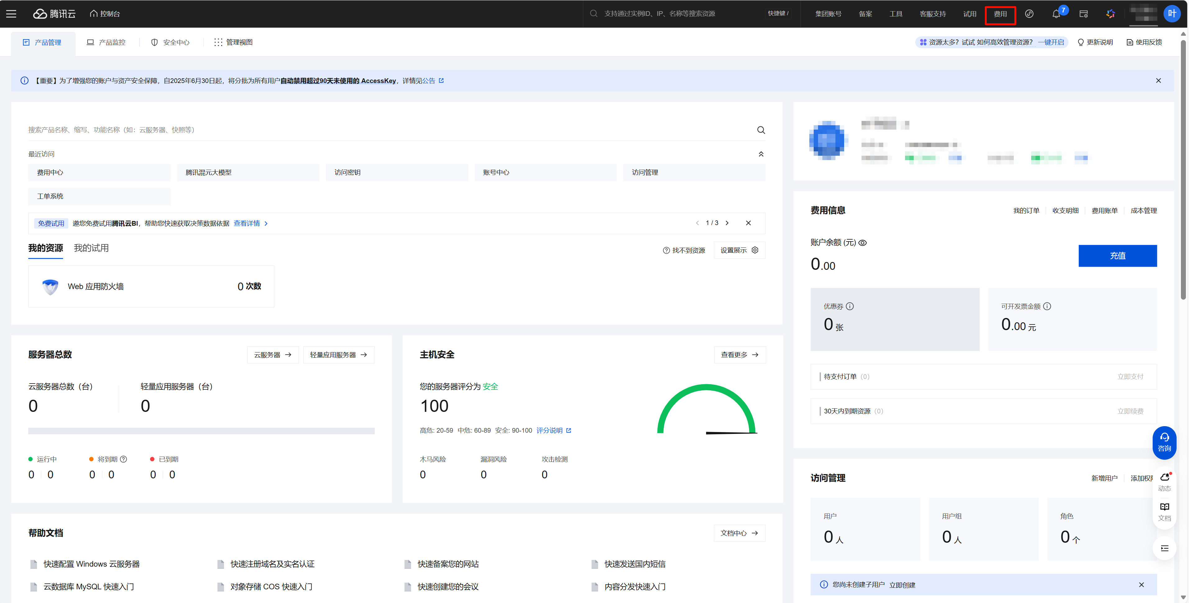 登录 腾讯云控制台,并单击费用,进入费用中心。